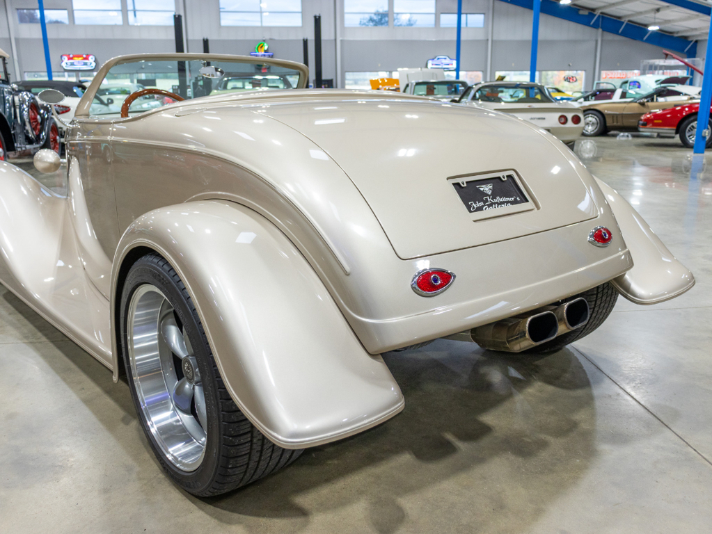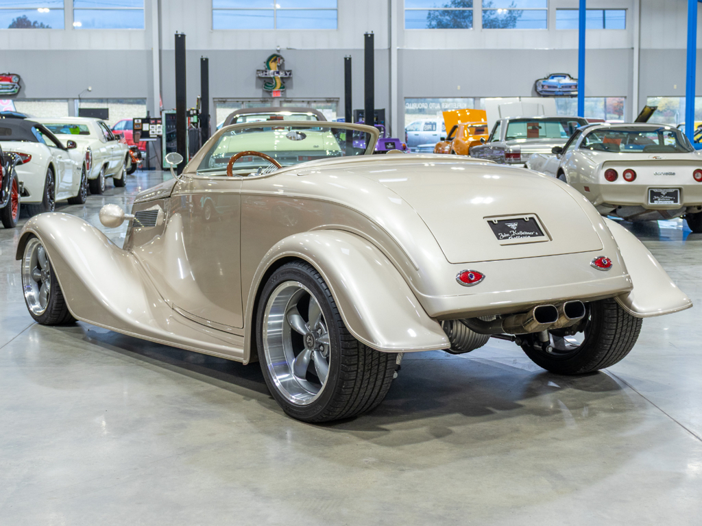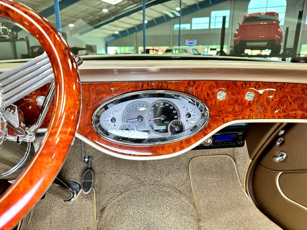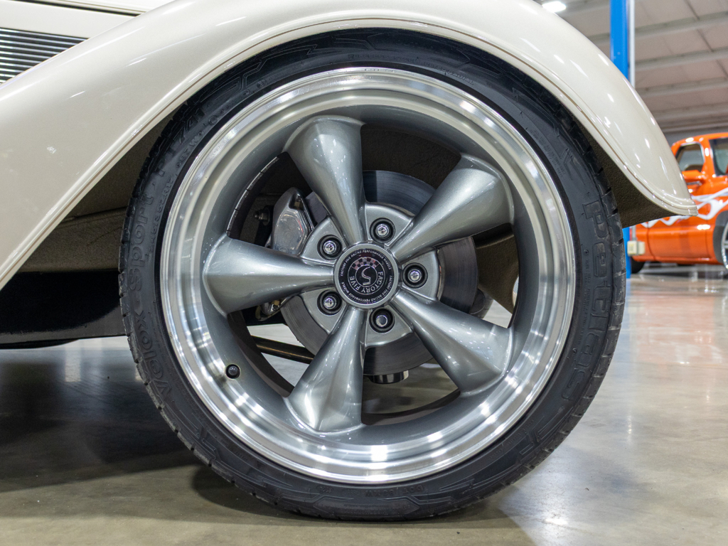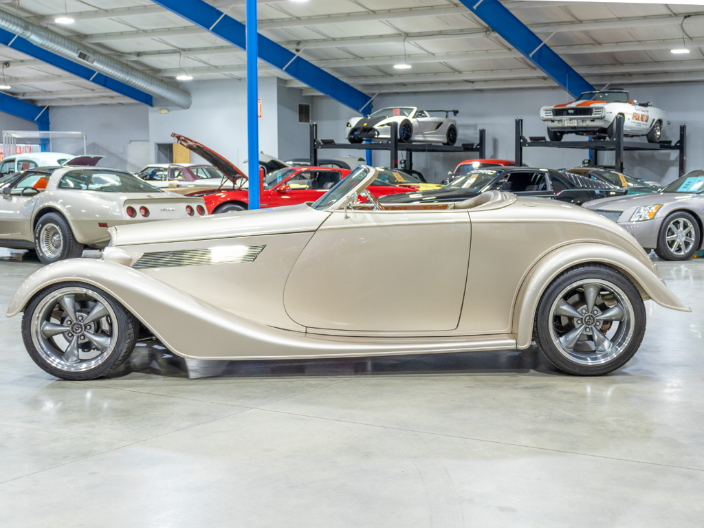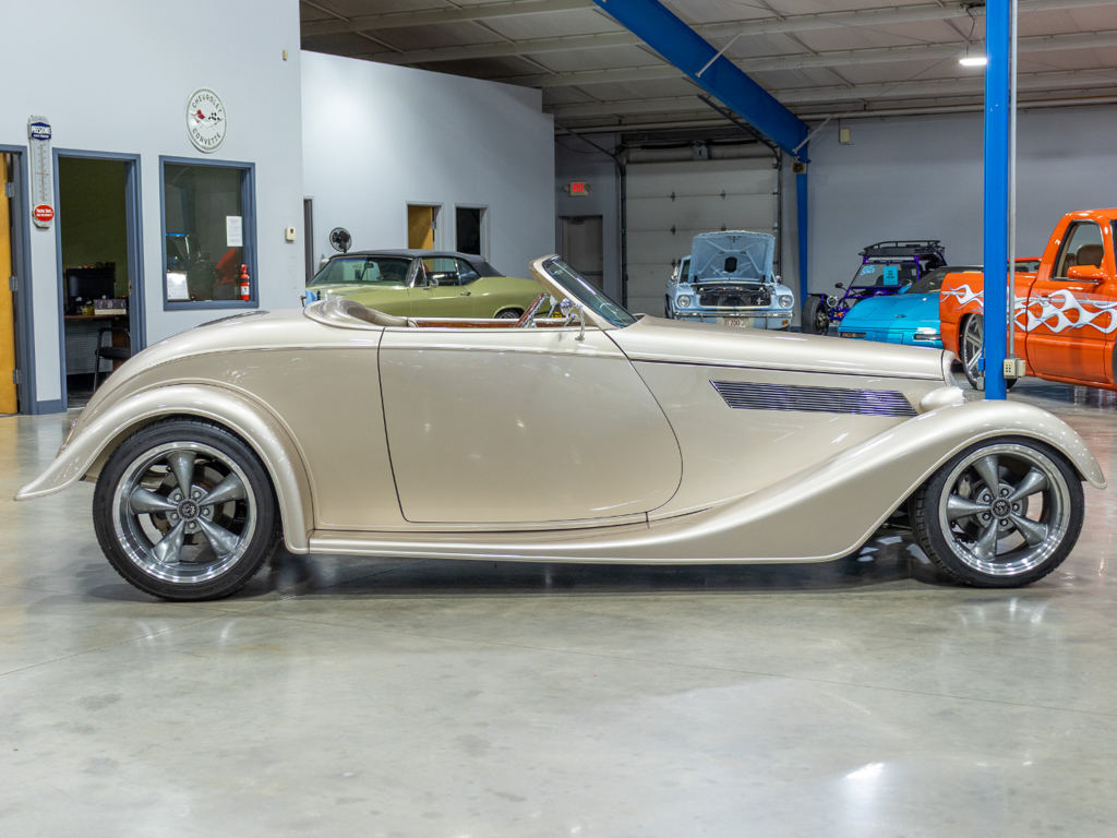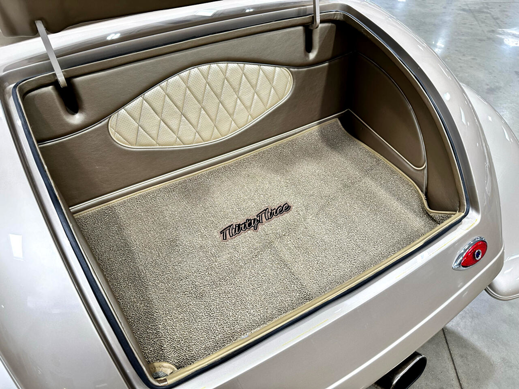 This street rod was built under previous ownership utilizing a full-fendered Factory Five Racing fiberglass body styled to resemble a 1933 Ford Roadster. It is finished in champagne beige and mounted on the Factory Five boxed steel frame. Power is provided by a 468ci stroker V8 paired with a four-speed automatic transmission, and the build also incorporates independent front suspension, a four-link rear setup, adjustable coilovers, rack-and-pinion steering, four-wheel disc brakes, staggered-diameter Torq Thrust-style wheels, a power-operated trunk, and a Ford 9 rear end. The cabin features two-tone dark beige and gold vinyl upholstery, bucket seats, wood veneer trim, a tilt-adjustable steering column, and Digital Dakota instrumentation. The full-fendered fiberglass body is finished in champagne beige, and it rides on a black-painted boxed steel frame. Exterior details include hood side-panel vents, running boards, reverse-hinged doors, and dual mirrors with integrated signal lights as well as a power-operated trunk lid and flush-mounted LED taillights. Staggered-diameter Torq Thrust-style wheels are finished in pewter and mounted with 245/35-17 front and 285/35-18 rear tires. Independent front suspension incorporates polished tubular A-arms and adjustable coilovers from Kugel Komponents, while the rear utilizes a triangulated four-link setup and adjustable QA1 coilovers. Braking is provided by four-wheel discs with polished Wilwood calipers up front, and the car is also equipped with rack-and-pinion steering.The interior features bucket seats and door panels trimmed in dark beige vinyl with gold diamond-quilted inserts, and the trunk is upholstered to match. The color-coordinated carpeting is overlaid with matching embroidered mats, and additional amenities include a push-button starter, a hard-wired remote control for the power trunk lid, and a Sony CD receiver.A woodgrain banjo-style steering wheel mounted atop a chrome tilt-adjustable column fronts a wood-veneer dashboard and a Dakota Digital elliptical instrument panel with an overlapping 160-mph speedometer, 8k-rpm tachometer, fuel-level gauge, and voltmeter flanked by coolant-temperature and oil-pressure gauges. The digital odometer indicates 522 miles.The Chevrolet 468ci stroker V8 is said to be based on a 427 block, and it breathes through a Holley four-barrel carburetor, an Edelbrock intake manifold, a K&N open-element air filter, and block-hugger headers flowing into a ceramic-coated dual exhaust system equipped with Magnaflow mufflers. Additional equipment includes an aluminum radiator, an electric fan, Smeding Performance valve covers, and an MSD Blaster 2 coil. Power is sent to the rear wheels through a 700R4 four-speed automatic transmission with a frame-rail-mounted cooler and a Ford 9? rear end with a 3.73:1 final gear set.The car has a clear Ohio title. It was assigned a VIN Identification Number CA959463 in California at time of completion where it was Inspected and first titled. Local to our Dealership? We are Open Monday-Friday 9-5!Not Local... NO Problem! We can organize delivery right to your door We ship over 200 vehicles every year...We are your Collector car Specialist and Shipping Experts! Financing is Available on all vehicles! Call with any Questions-*** HAVE QUESTIONS? No Problem!! *** Call or Text: -Mark (Showroom Manager) 808-286-8101 or-Chris (Online Sales) 330-990-6970