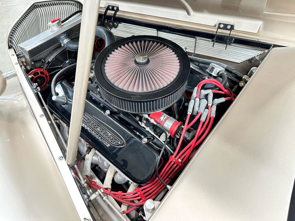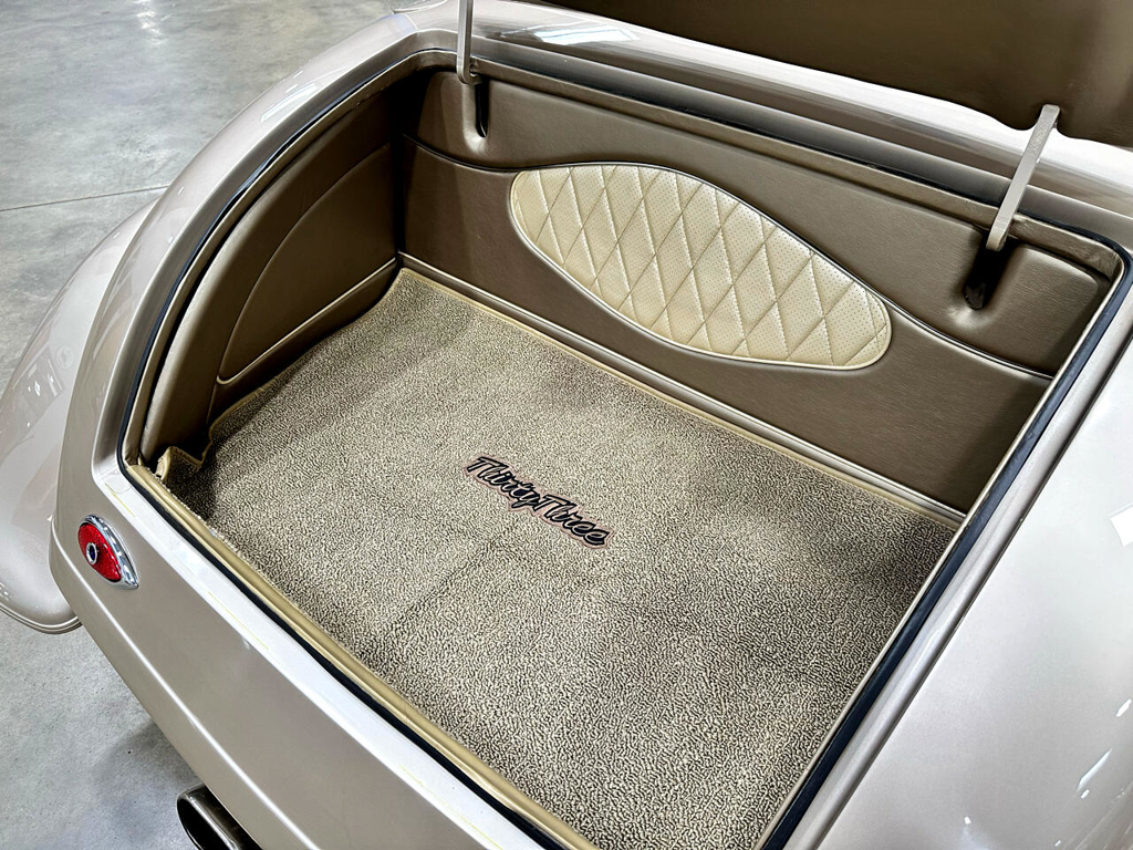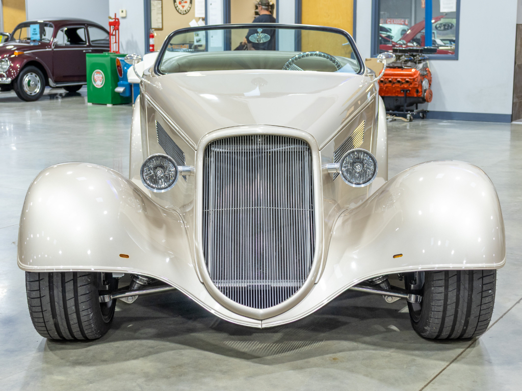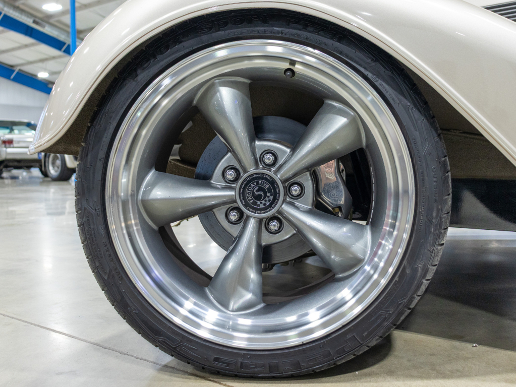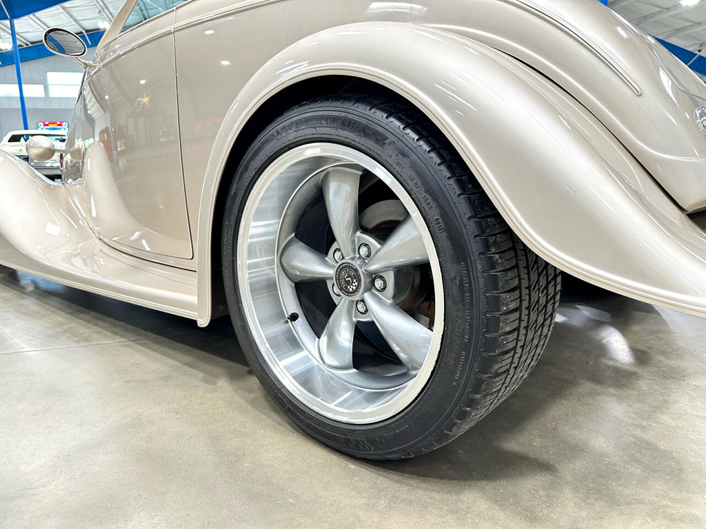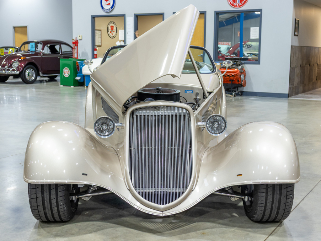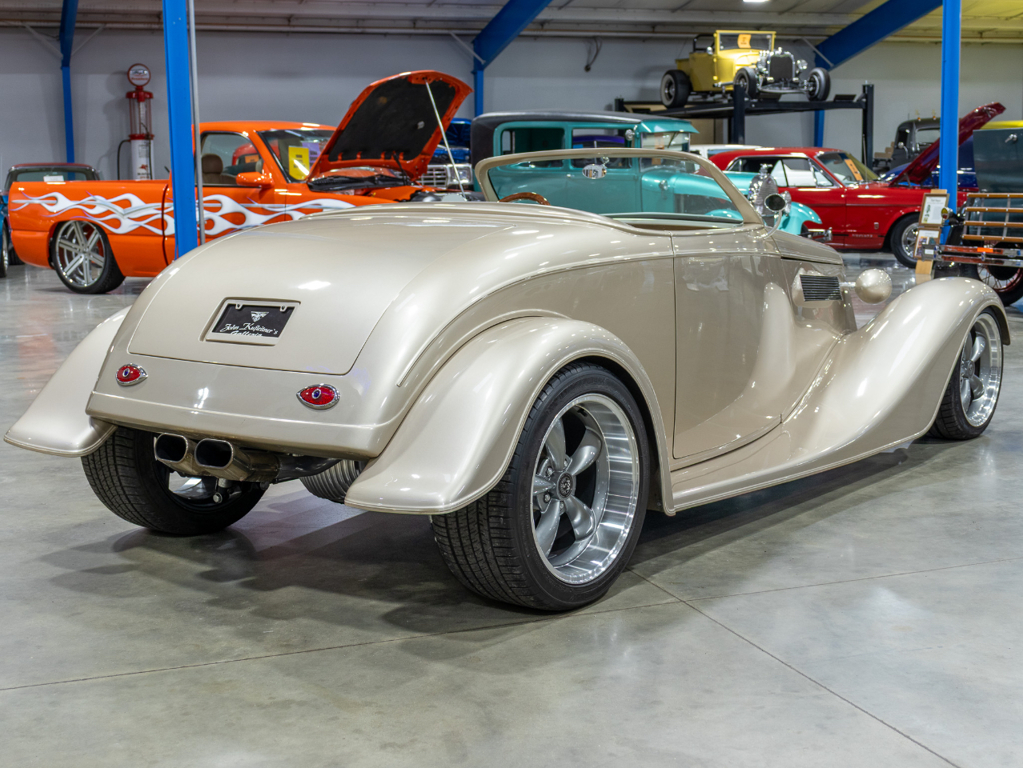 This street rod was built under previous ownership utilizing a full-fendered Factory Five Racing fiberglass body styled to resemble a 1933 Ford Roadster. It is finished in champagne beige and mounted on the Factory Five boxed steel frame. Power is provided by a 468ci stroker V8 paired with a four-speed automatic transmission, and the build also incorporates independent front suspension, a four-link rear setup, adjustable coilovers, rack-and-pinion steering, four-wheel disc brakes, staggered-diameter Torq Thrust-style wheels, a power-operated trunk, and a Ford 9 rear end. The cabin features two-tone dark beige and gold vinyl upholstery, bucket seats, wood veneer trim, a tilt-adjustable steering column, and Digital Dakota instrumentation. The full-fendered fiberglass body is finished in champagne beige, and it rides on a black-painted boxed steel frame. Exterior details include hood side-panel vents, running boards, reverse-hinged doors, and dual mirrors with integrated signal lights as well as a power-operated trunk lid and flush-mounted LED taillights. Staggered-diameter Torq Thrust-style wheels are finished in pewter and mounted with 245/35-17 front and 285/35-18 rear tires. Independent front suspension incorporates polished tubular A-arms and adjustable coilovers from Kugel Komponents, while the rear utilizes a triangulated four-link setup and adjustable QA1 coilovers. Braking is provided by four-wheel discs with polished Wilwood calipers up front, and the car is also equipped with rack-and-pinion steering.The interior features bucket seats and door panels trimmed in dark beige vinyl with gold diamond-quilted inserts, and the trunk is upholstered to match. The color-coordinated carpeting is overlaid with matching embroidered mats, and additional amenities include a push-button starter, a hard-wired remote control for the power trunk lid, and a Sony CD receiver.A woodgrain banjo-style steering wheel mounted atop a chrome tilt-adjustable column fronts a wood-veneer dashboard and a Dakota Digital elliptical instrument panel with an overlapping 160-mph speedometer, 8k-rpm tachometer, fuel-level gauge, and voltmeter flanked by coolant-temperature and oil-pressure gauges. The digital odometer indicates 522 miles.The Chevrolet 468ci stroker V8 is said to be based on a 427 block, and it breathes through a Holley four-barrel carburetor, an Edelbrock intake manifold, a K&N open-element air filter, and block-hugger headers flowing into a ceramic-coated dual exhaust system equipped with Magnaflow mufflers. Additional equipment includes an aluminum radiator, an electric fan, Smeding Performance valve covers, and an MSD Blaster 2 coil. Power is sent to the rear wheels through a 700R4 four-speed automatic transmission with a frame-rail-mounted cooler and a Ford 9? rear end with a 3.73:1 final gear set.The car has a clear Ohio title. It was assigned a VIN Identification Number CA959463 in California at time of completion where it was Inspected and first titled. Local to our Dealership? We are Open Monday-Friday 9-5!Not Local... NO Problem! We can organize delivery right to your door We ship over 200 vehicles every year...We are your Collector car Specialist and Shipping Experts! Financing is Available on all vehicles! Call with any Questions-*** HAVE QUESTIONS? No Problem!! *** Call or Text: -Mark (Showroom Manager) 808-286-8101 or-Chris (Online Sales) 330-990-6970