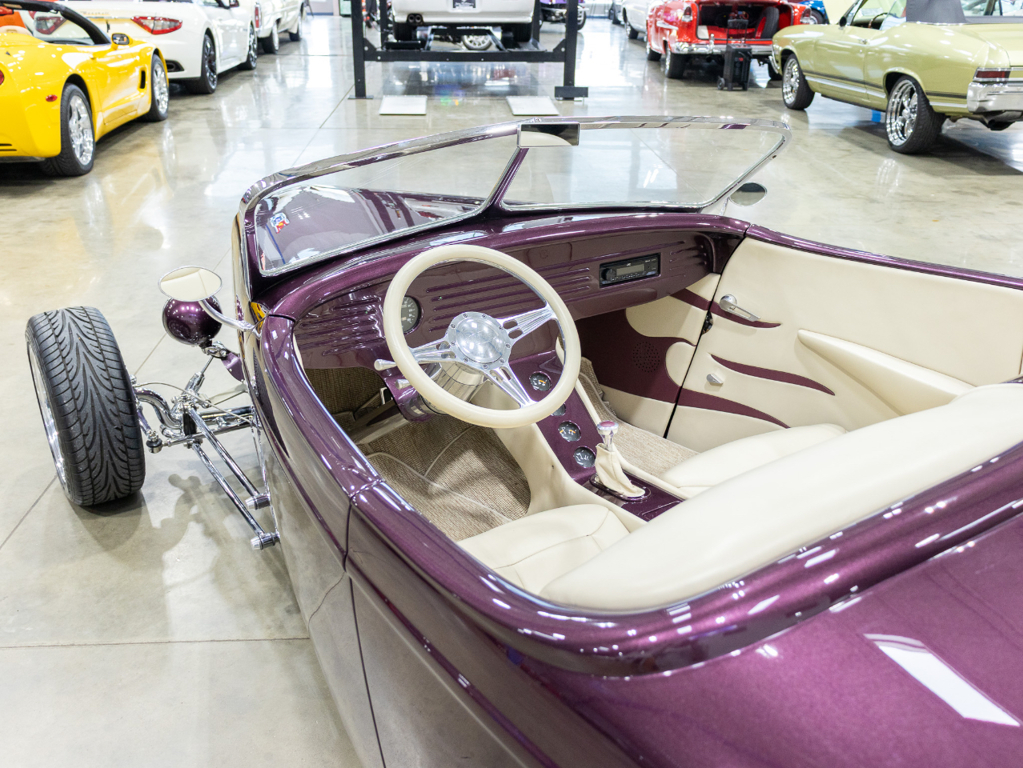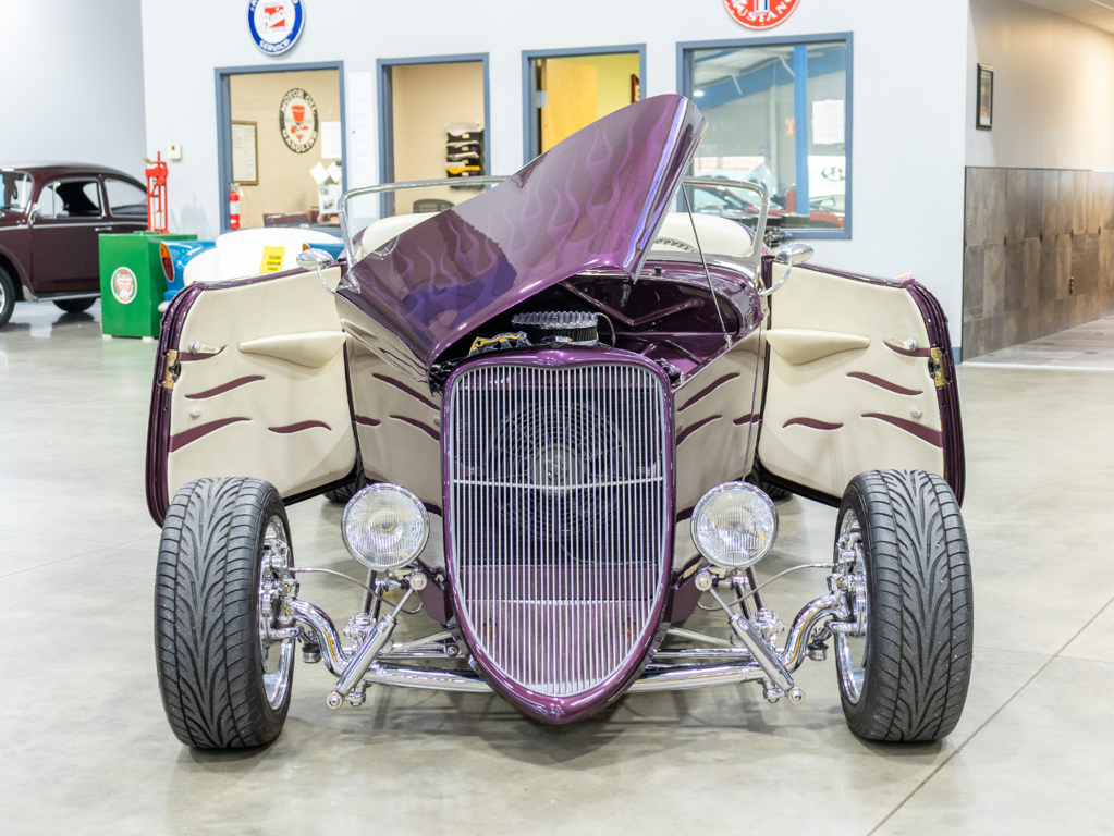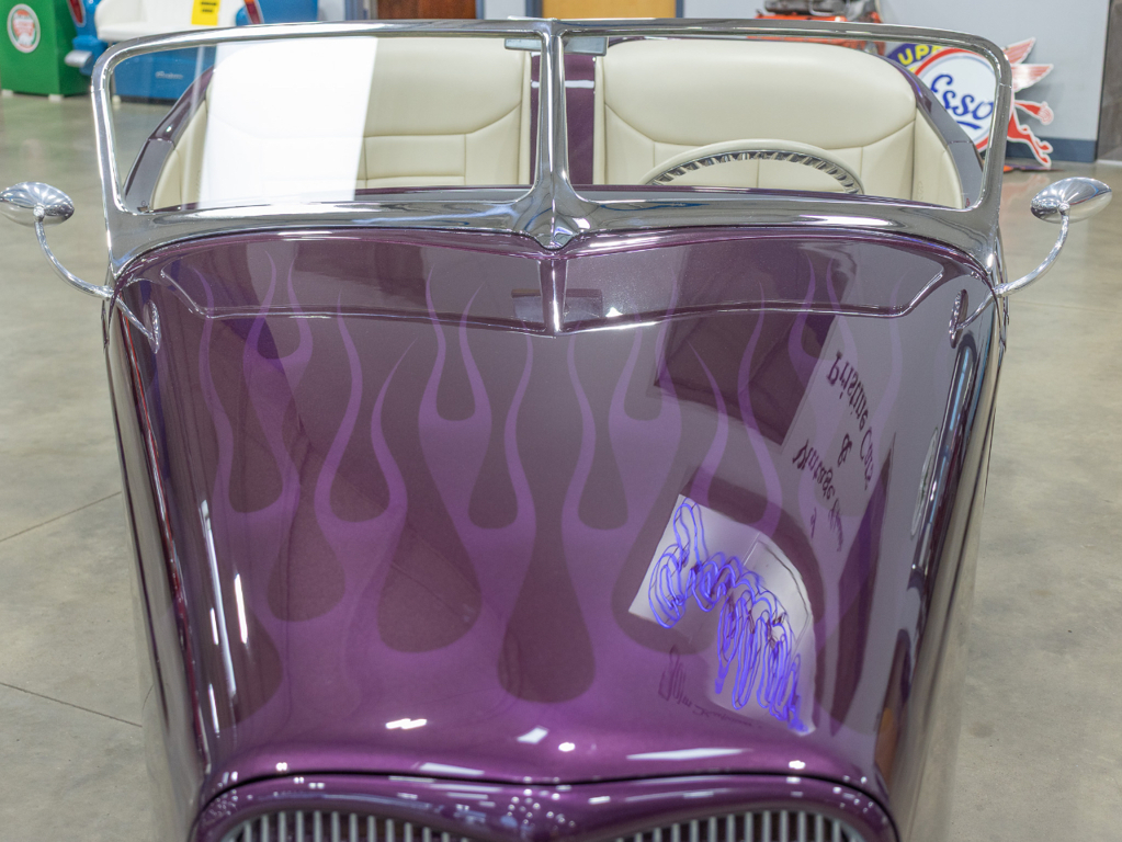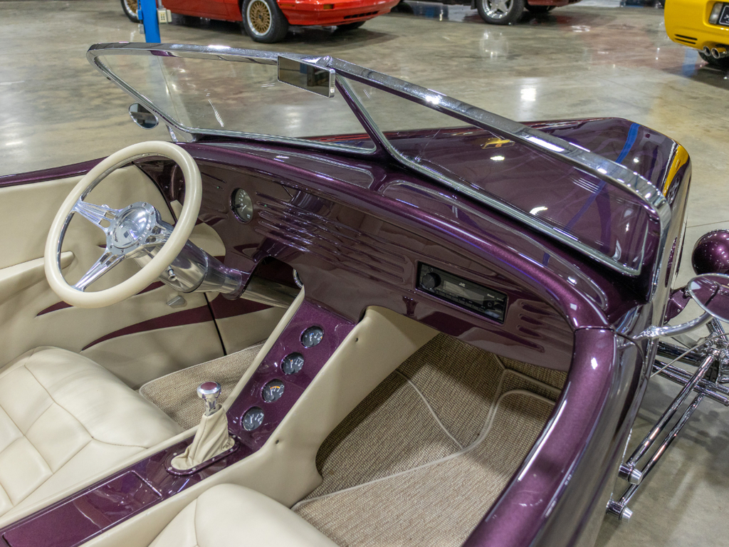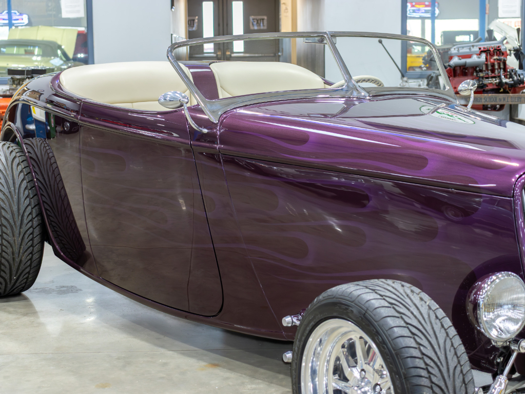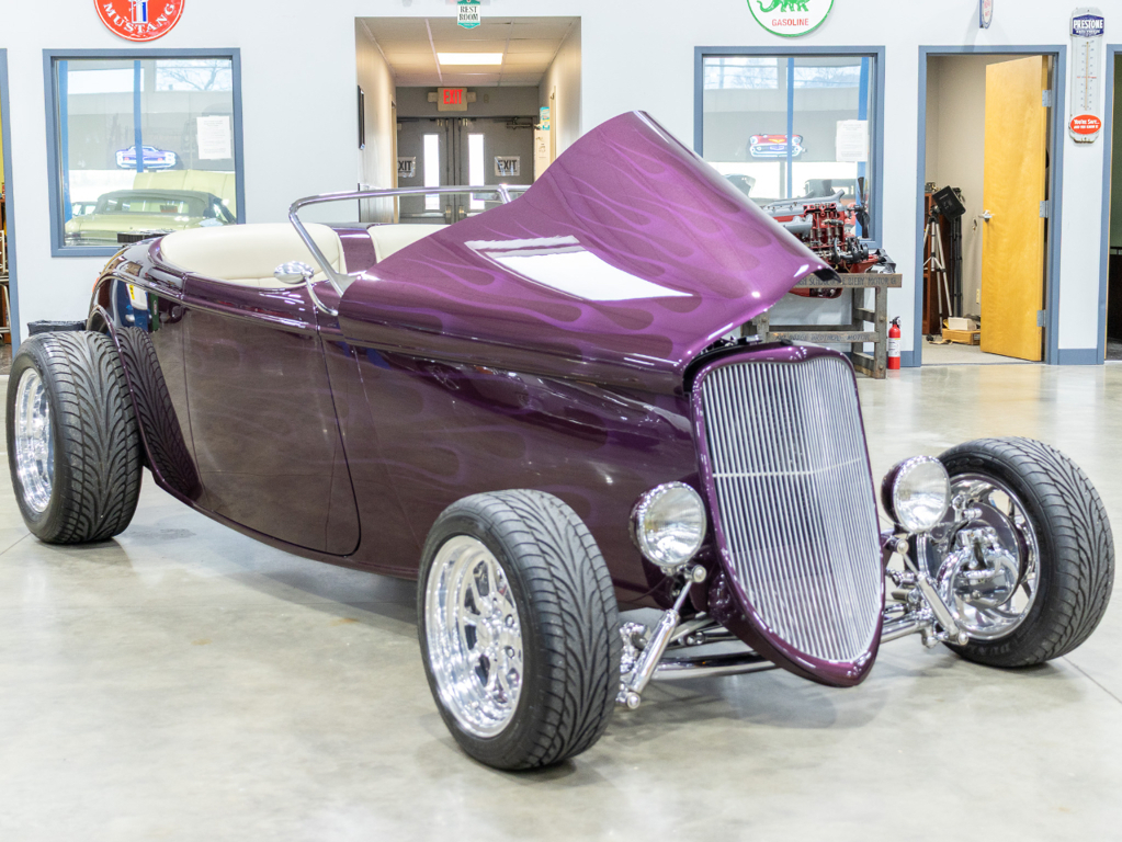 This unique 34 Roadster showcases beautiful custom purple paint with ghost flames, side open hood & a chrome front end sitting on top of a beautiful set of Budnik wheels. The underside is just as pretty as the top with a custom painted undercarriage, custom stainless exhaust, chrome 4 link rear end, & a custom roll pan to hide it from the rear for a super smooth look. Under the side tilt hood, is an impressive 383 stroker with a heavy cam smoothed & painted to match down to the radiator. The interior is as nice as it gets with a custom aluminum waterfall console & aluminum dash. Custom waterfall seats will have you riding in comfort while looking thru the awesome chrome DuVall windshield. In the rear is a power trunk lid & matching custom upholstered trunk cargo bay. This is well over a 6 figure build that will not disappoint. It is truly one of the nicest 34 roadsters that we've ever laid our eyes on!!! Local to our Dealership? We are Open Monday-Friday 9-5!Not Local... NO Problem! We can organize delivery right to your door We ship over 200 vehicles every year...We are your Collector car Specialist and Shipping Experts! Financing is Available on all vehicles! Call with any Questions-*** HAVE QUESTIONS? No Problem!! *** Call or Text: -Mark (Showroom Manager) 808-286-8101 or-Chris (Online Sales) 330-990-6970