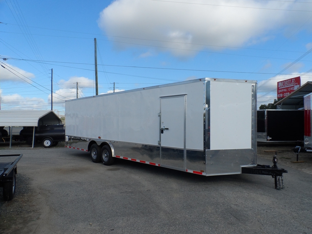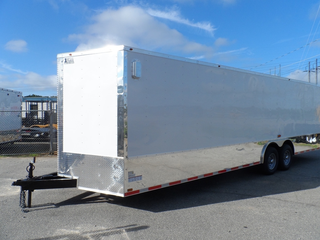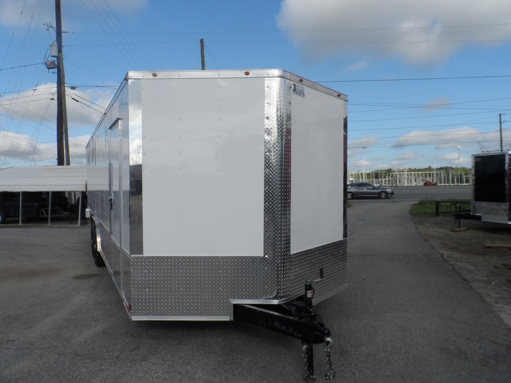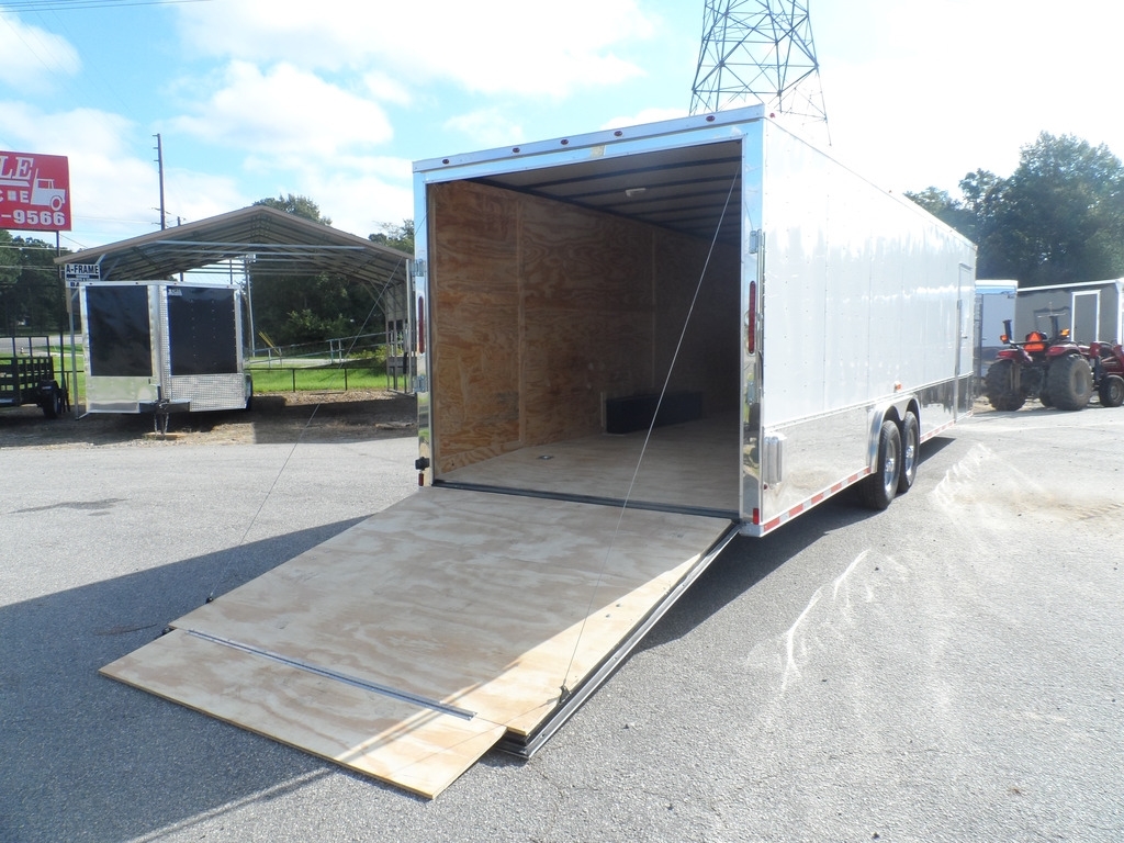 You are bidding on a brand new 8.5x28 carhauler cargo trailer White and anodized sides with ramp, and side door. This trailer is loaded with options.
