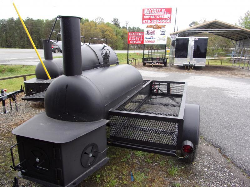 250 Reverse Flow Bubba Grill concession smoker on 5x10 utility trailer with storage down one side. This BBQ PIT SMOKER has gas starter in the fire box and has Double Burners on the front for anything from fish frying to low country boil. It also has a double floor inside for char coal. You can grill steaks chicken hamburger and more. Large fire box with gas starter to start wood or coal fire. Great for smoking baby back ribs Boston butts brisket.and more