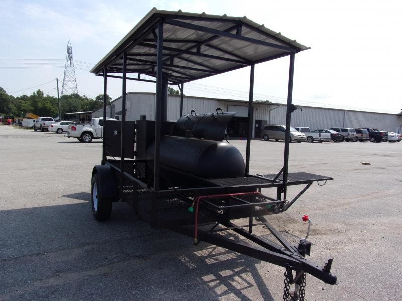 250 Reverse Flow Bubba Grill concession smoker Rib Box on 5x10 with a roof on the utility trailer with storage down one side. This BBQ PIT SMOKER has gas starter in the fire box and has Double Burners on the front for anything from fish frying to low country boil. It also has a double floor inside for char coal. You can grill steaks chicken hamburger and more. Large fire box with gas starter to start wood or coal fire. Great for smoking baby back ribs Boston butts brisket.and more