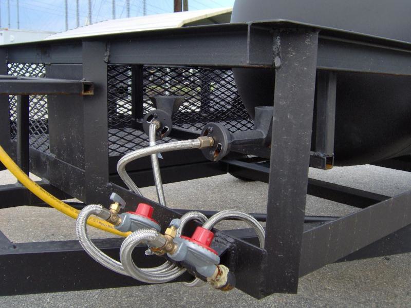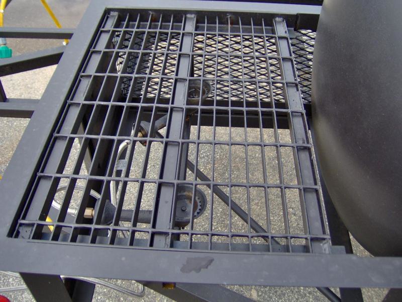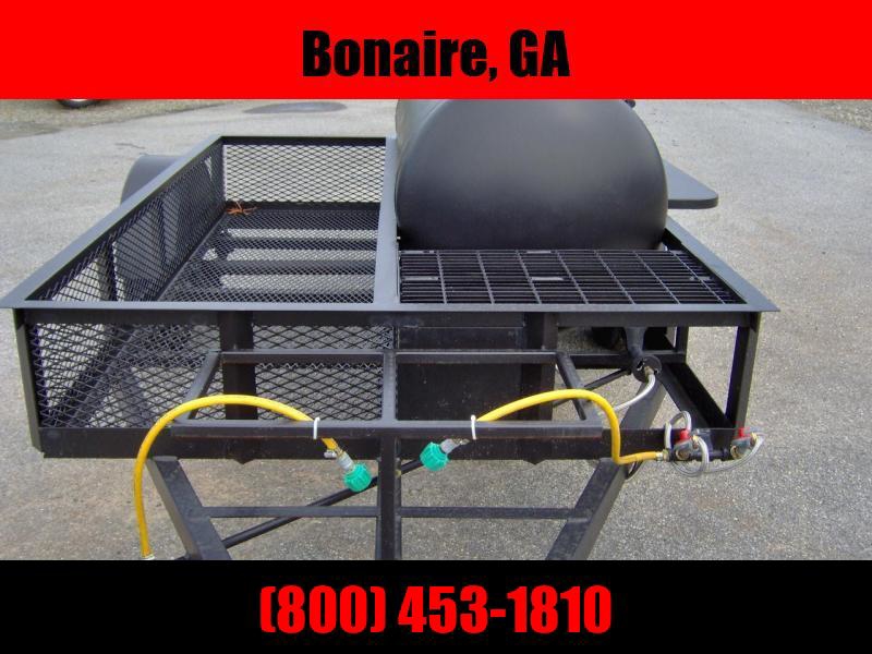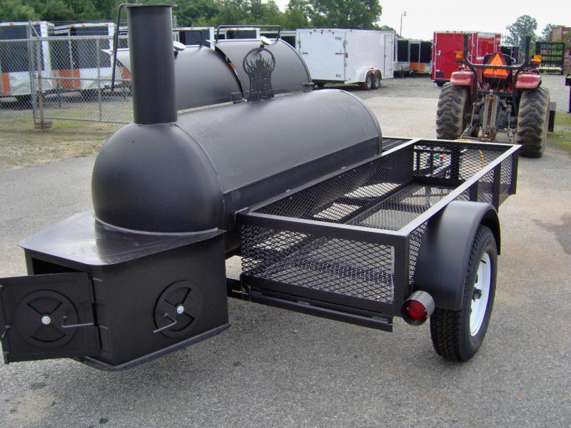 250 Reverse Flow Bubba Grill concession smoker on 5x10 utility trailer with storage down one side. This BBQ PIT SMOKER has gas starter in the fire box and has Double Burners on the front for anything from fish frying to low country boil. It also has a double floor inside for char coal. You can grill steaks chicken hamburger and more. Large fire box with gas starter to start wood or coal fire. Great for smoking baby back ribs Boston butts brisket.and more