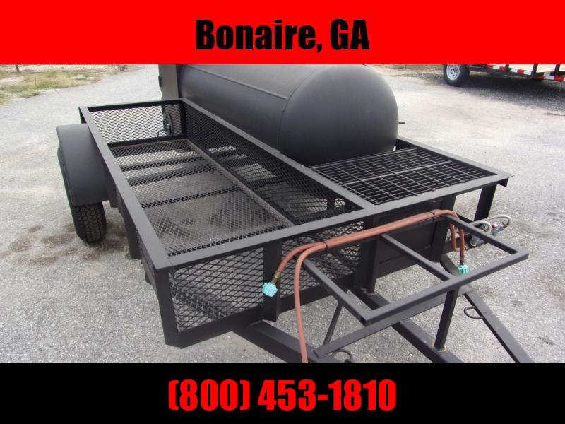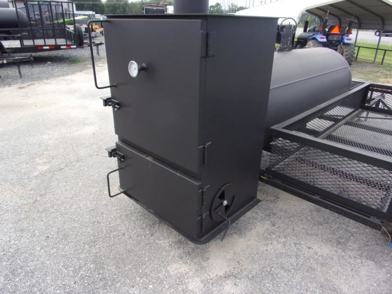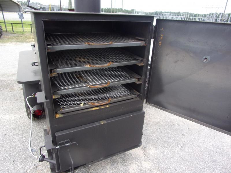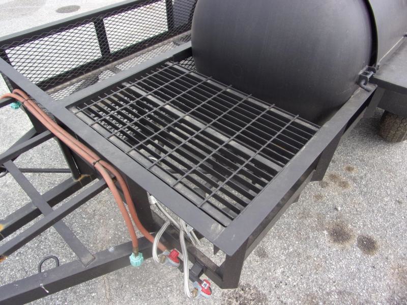 250 Reverse Flow Bubba Grill concession smoker on 5x10 utility trailer with storage down one side. This BBQ PIT SMOKER has gas starter in the fire box and has Double Burners on the front for anything from fish frying to low country boil. It also has a double floor inside for char coal. You can grill steaks chicken hamburger and more. Large fire box with gas starter to start wood or coal fire. Great for smoking baby back ribs Boston butts brisket.and more
