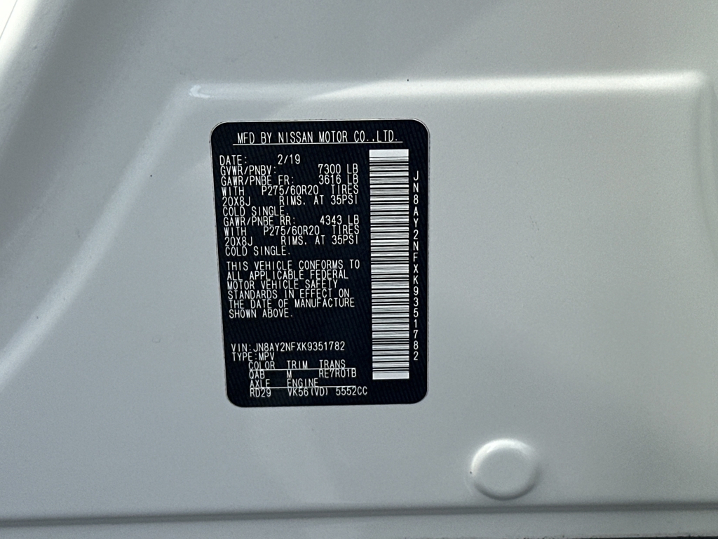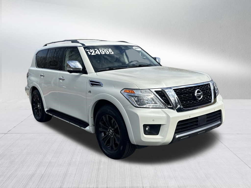 PLATINUM EDITION, 4 BRAND NEW TIRES, REAR ENTERTAINMENT DUAL SCREENS, GPS / NAVIGATION, MOONROOF / SUNROOF, REAR BACK UP CAMERA, ADAPTIVE CRUISE CONTROL, BLIND SPOT & CROSS PATH DETECTION, LANESENSE LANE DEPARTURE WARNING PLUS, FORWARD COLLISION WARNING PLUS, FACTORY TRAILER BRAKE, LEATHER INTERIOR, TOUCHSCREEN DISPLAY, MIDDLE ROW CAPTAIN CHAIRS, 3RD ROW SEATING, HEATED SEATS, HEATED STEERING WHEEL, VENTILATED FRONT SEATS, BOSE AUDIO, SATELLITE RADIO, KEYLESS ENTRY, PUSH BUTTON START, REMOTE START, SIDE AIRBAGS, POWER LIFTGATE, FRONT & REAR PARK ASSIST SENSORS, BLUETOOTH, STEERING WHEEL MOUNTED AUDIO CONTROLS, DUAL POWER SEAT WITH DRIVER MEMORY, DUAL ZONE FRONT CLIMATE, REAR ZONE CLIMATE, FACTORY SECURITY SYSTEM, RUNNING BOARDS, FOG LAMPS, TOWING PACKAGE / HITCH, TIRE PRESSURE MONITORING DISPLAY, ALL POWER AND MUCH MORE, CARFAX CERTIFIED, EXTENDED WARRANTY AVAILABLE, SOME OFFERS INCLUDE FINANCING WITH APPROVED LENDERS FOR ADVERTISED PRICE.. Pearl White Tricoat 2019 Nissan Armada Platinum 5.6L V8 DOHC 32V Endurance RWDMUST MENTION OR PRESENT AD AT TIME OF PURCHASE TO RECEIVE THE ADVERTISED PRICE. Welcome to Palmer DCJR! We are proud to be a family-owned business serving the greater Roswell area for 30 years. Here at Palmer, we make customer service our top priority. We are also pleased to be able to offer a buying process that can be completed from start to finish online! We will deliver your new vehicle right to your door. Whether you are in search of your next car or looking for a service center you can trust, Palmer Dodge Chrysler Jeep Ram is the place to go. Give us a call, fill out our online form, or stop by for an incredible automotive experience today! THE ADVERTISED PRICE INCLUDES ALL INCENTIVES INCLUDING IRS EV CREDIT BUT DOES NOT INCLUDE SALES TAX, VEHICLE REGISTRATION FEES, OTHER FEES REQUIRED BY LAW, OR FINANCE CHARGES. SOME OFFERS INCLUDE FINANCING WITH APPROVED LENDERS FOR ADVERTISED PRICE. Awards:* 2019 KBB.com 5-Year Cost to Own Awards Palmer Dodge is proudly serving... Atlanta, Buckhead, Duluth, Suwanee, Alpharetta, Cumming, Gainesville, Flowery Branch, Buford, Roswell, Jasper, Canton, Woodstock, Peachtree, Ball Ground, Jefferson, Athens, Augusta, Buford, Conyers, Decatur, Tucker, Milton, Douglasville, Alpharetta, Marietta, Sandy Springs, Dunwoody, Johns Creek, Lawrenceville, Lilburn, Chamblee, Stone Mountain, Vinings, Norcross, Oakwood, Sugar Hill, Athens, Kennesaw, Dawsonville. We also service the following states... Georgia, Florida, Alabama, South Carolina, North Carolina, Mississippi, & more.