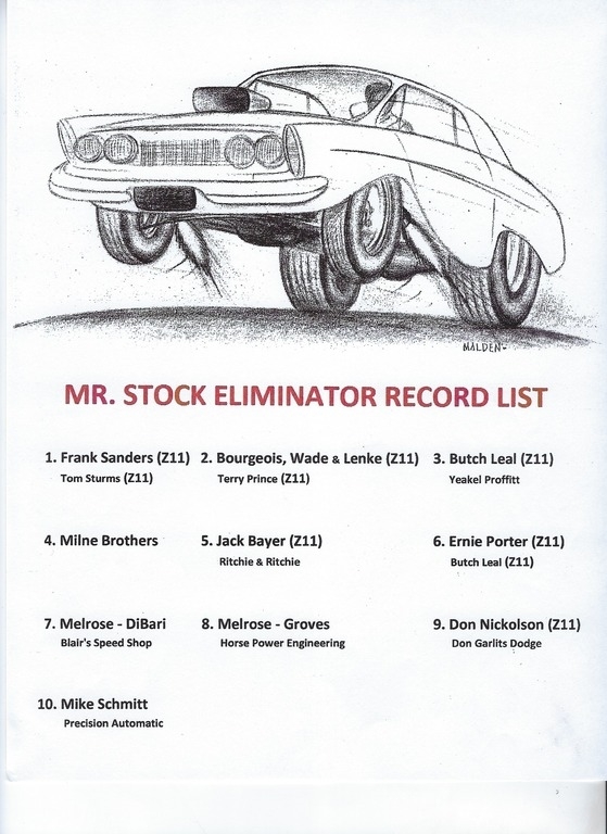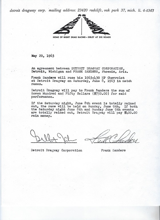 Frank Sander's Z-11 car started out on Mr. Stock Eliminator Record List in #3 position on day one in February 1963 and moved up to #1 position in April 1963 when he beat Tom Sturm's Z-11. Frank Sander's Z-11 car was the only drag car on the Drag News Top - 10 Mr. Stock Eliminator Record List the entire year of 1963, winning 19 out of 20 (95%) match races, with his only loss the entire year of 1963 was to Dyno Don Nickolson's Z-11, switching their top ten positions. Because of Frank Sander's racing dominance, he achieved the "Drag News - Mr. Stock Eliminator 1963 National Champion". Because of the weekly national publications in Drag News, the majority of the Top Racers in the country tried to get on Drag News's top ten list because Drag News National Publications created a much higher viewer attendance, which also allowed the Top Racers to receive much higher racing fees that were paid out by the competing racetracks. As an example, an attached contract with "DETROIT DRAGWAY" for a June 9, 1963, stock car drag race paid Frank Sanders a $750.00 racing fee to defend his #1 position (best 2 out of 3) against the very successful 1963 Dodge Ram charger "Candy matic".