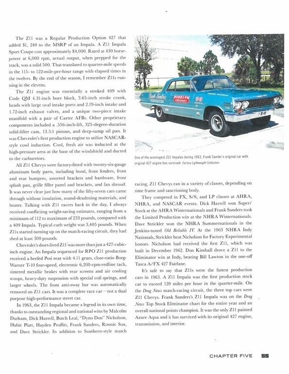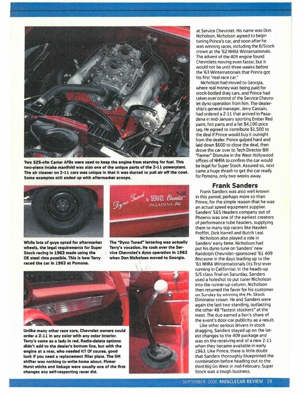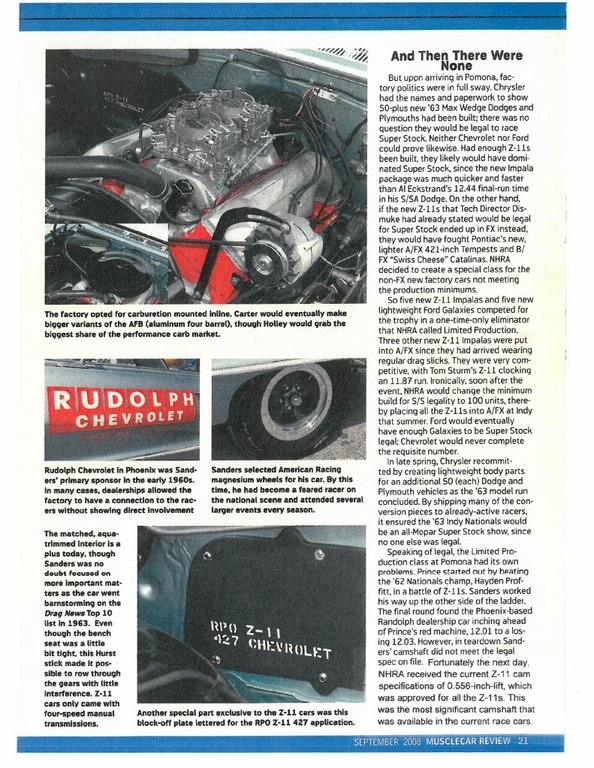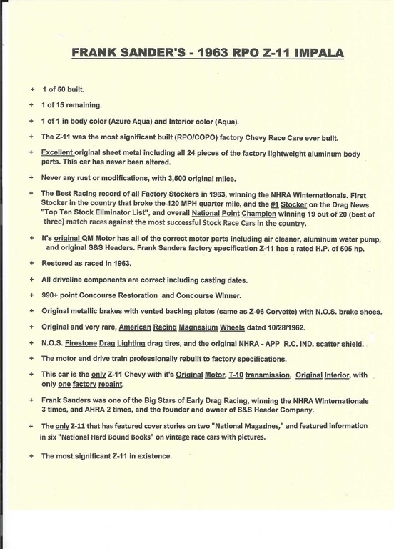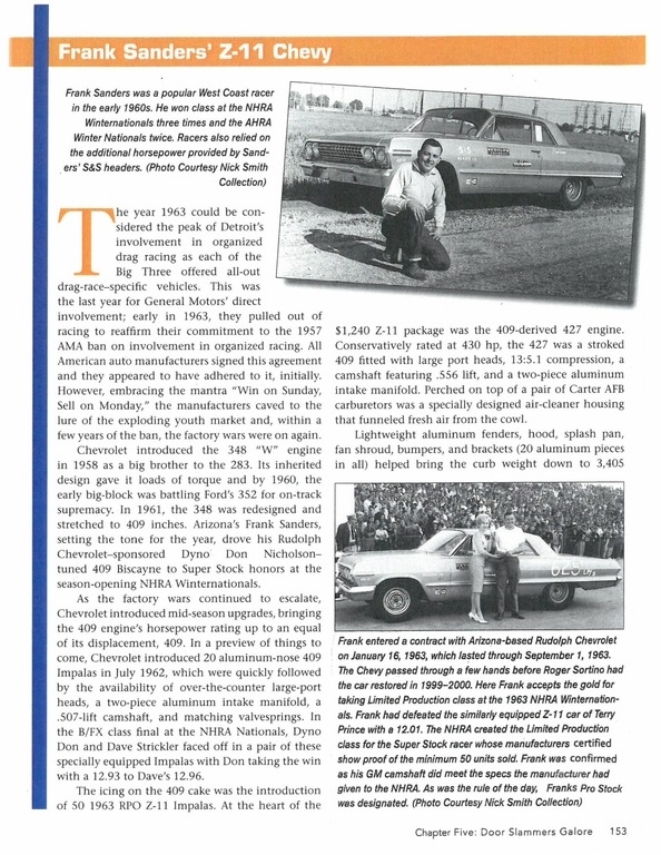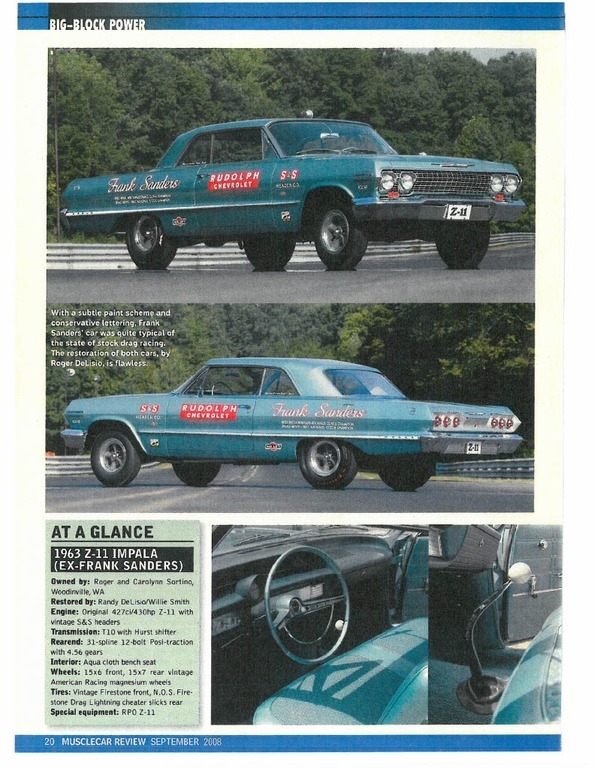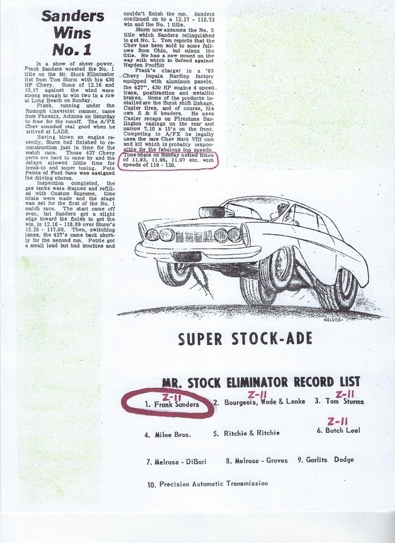 Frank Sanders Z-11 car started off in January of 1963 by being the VERY FIRST LEGAL FACTORY STOCK DRAG CAR in the country that broke the 120 MPH barrier. Frank Sanders' car then won "NHRA Winter nationals Class Champion" in the "Limited Production Stock" class in February of 1963.