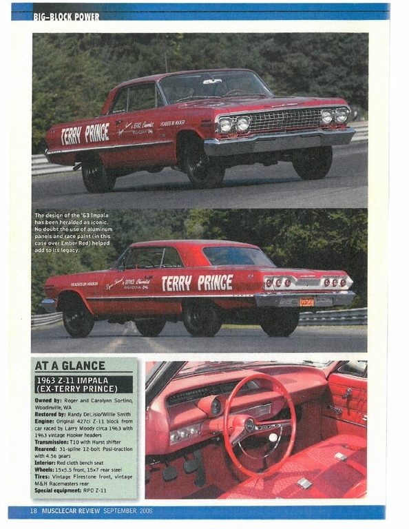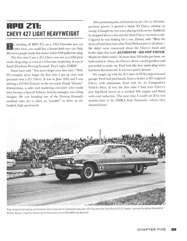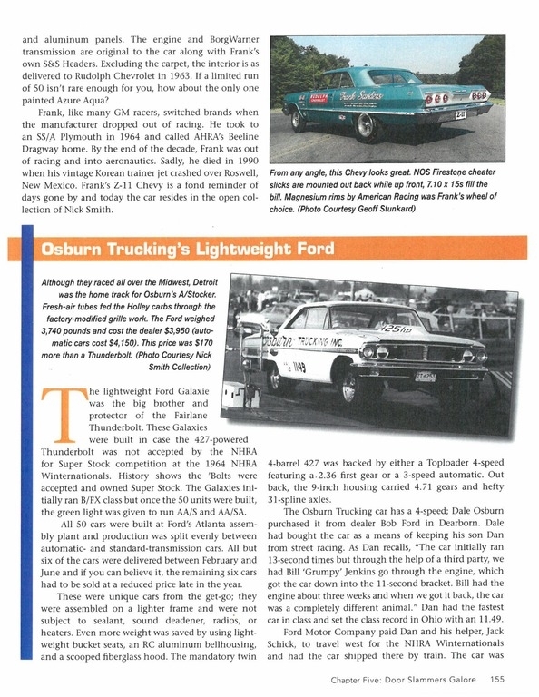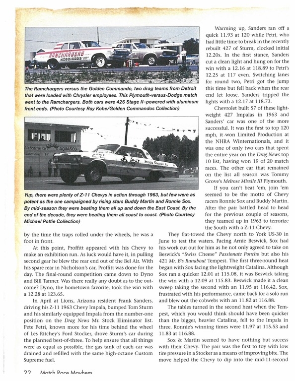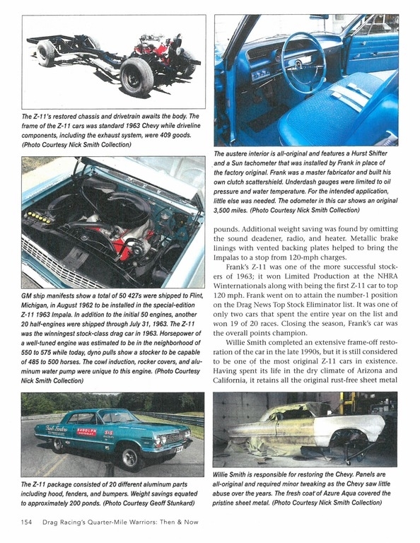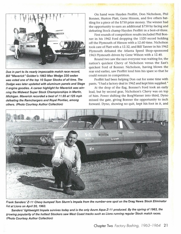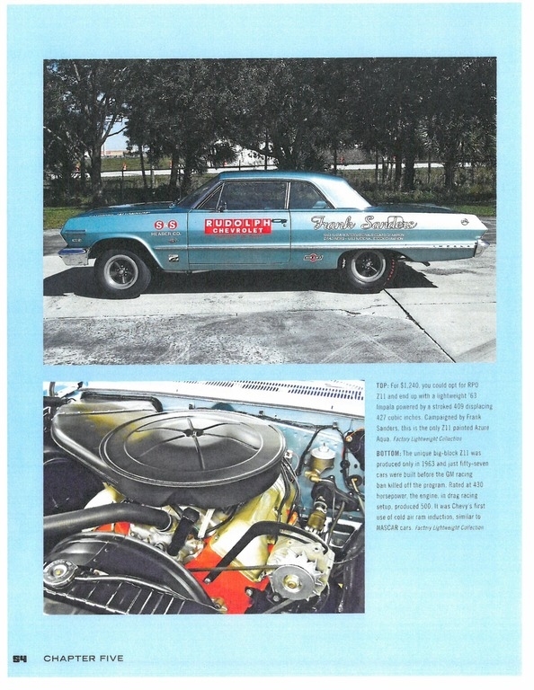 Frank Sanders Z-11 car started off in January of 1963 by being the VERY FIRST LEGAL FACTORY STOCK DRAG CAR in the country that broke the 120 MPH barrier. Frank Sanders' car then won "NHRA Winter nationals Class Champion" in the "Limited Production Stock" class in February of 1963.
