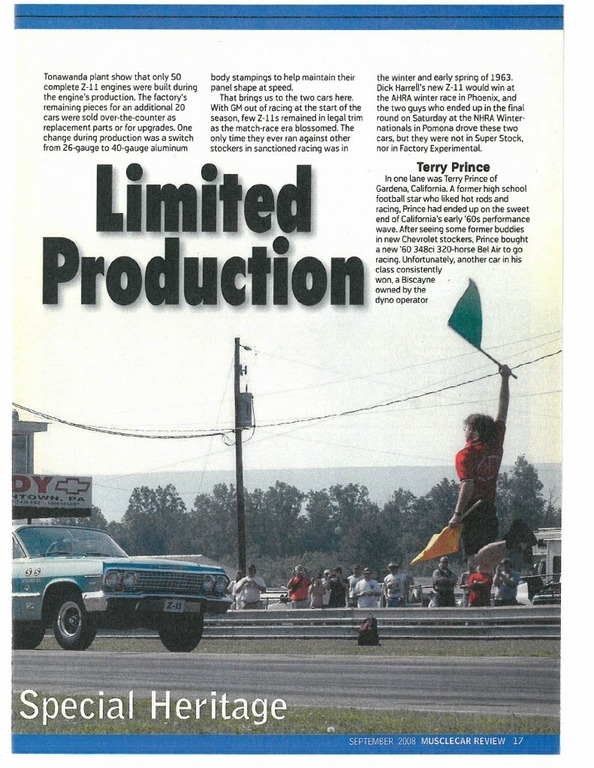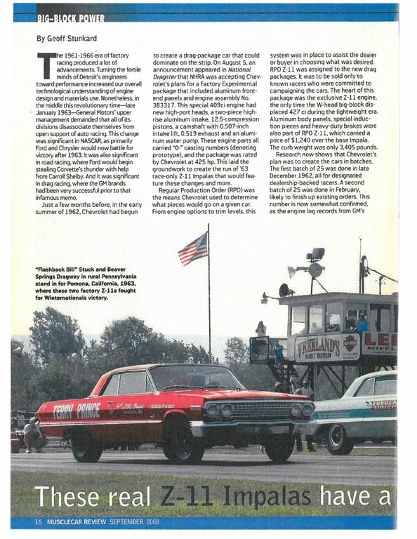 A very big plus for Chevy Z-11's were their strong race domination on Drag News - Mr Stock Eliminator List. Chevy built only 50 Z-11 cars (2%) out of a total of 2,500 other Drag Racing Cars built in 1963 that were eligible, with 3 Chevy Z-11's as the ONLY factory drag car that achieved a #1 position on the Drag News list throughout the entire year 1963. The balance of the Z-11's cars retained between three to six positions (30% to 60%) in the top 10 racing list throughout the year. The attached Mr. Stock Eliminator List from the summer of 1963 shows the dominance of the Z-11 cars which have achieved 6 of the top 10 stock eliminators, plus the Terry Prince's Z-11 and Tom Sturm's Z-11, which were also in the top ten list prior to this particular time. Summarizing the full year of 1963, the only 3 cars that achieved a # 1 position on the "Drag News - Top 10 Mr. Stock Eliminator List" were Frank Sanders (Z-11), Dyno Don Nickolson's (Z-11), and Tom Sturm's (Z-11).