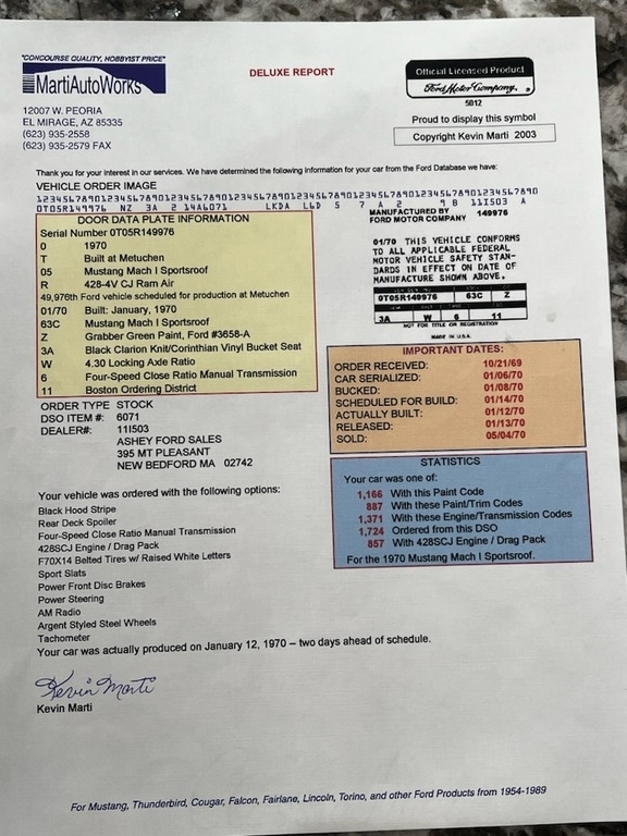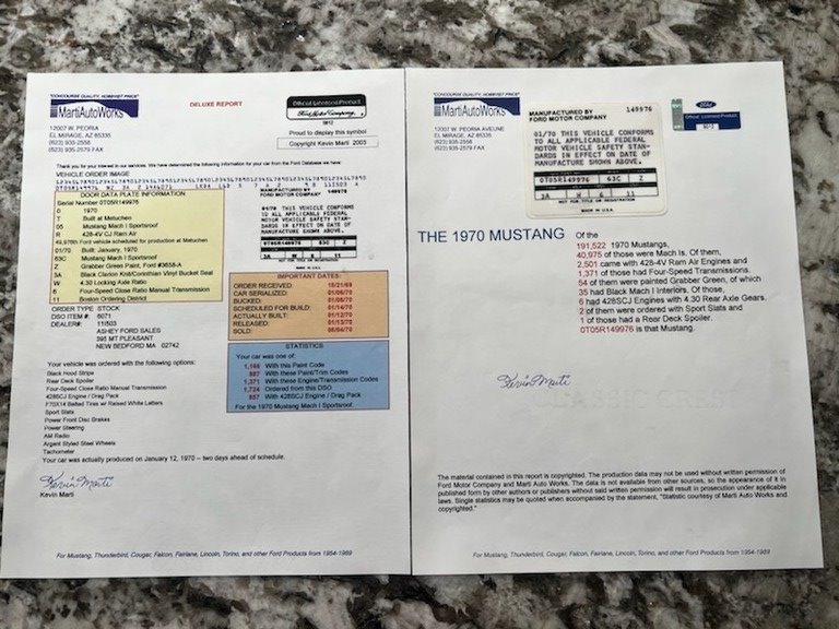 Get ready to fulfill your dream with this 1970 Ford Mustang Mach 1 428 Cobra Jet! The Mustang features a sleek, athletic styling that has become an icon of the pony car industry. It is dressed in a stunning Grabber Green exterior and is complimented by an exceptionally clean Black Vinyl interior. Powered by the 428 SCJ Engine that is mated with a 4-speed close ratio manual transmission, this car's mechanical setup is brimming with all of the innovative engineering for which mustang is known. Your only challenge will be finding a slab of concrete worthy of unleashing this car's unbridled authority.