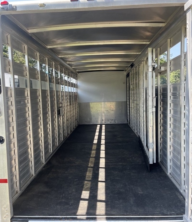 The Rancher TR by Sundowner is an all-aluminum gooseneck stock trailer with a tack room, converted to a great weekender LQ space. Unique to this trailer is an after-market weekender LQ conversion complete with a fully insulated tack room/living space, AC/Heat unit, outlet, electrical hook up, carpeted wall, nose and ceiling, wipeable walls, rollup blinds and valances in nose, and rubber mat floor for easy cleaning. The heat and ac work so well you'll be roasty toasty in the winter and cool as a cucumber in the summer (like a freezer if you want it to be)! Also, we are original owner, we purchased the trailer new! It is a total of 24' in length, 20’ in the horse box, and the 4’ tack room has a locking door, carpeted nose, rubber floor mats, tack hooks and dome light. It comes standard 7’ tall and 6’9” wide. Standard equipment also includes a full swing rear gate with sliding calf gate, a center cut gate and a side access door with full height cam latch. The Rancher TR is built with tough extruded side walls including 2 air gaps that come with tinted Plexiglas slides to allow for a wide range of ventilation options. The Rancher TR is built with the same quality and standards that people expect from a Sundowner trailer.