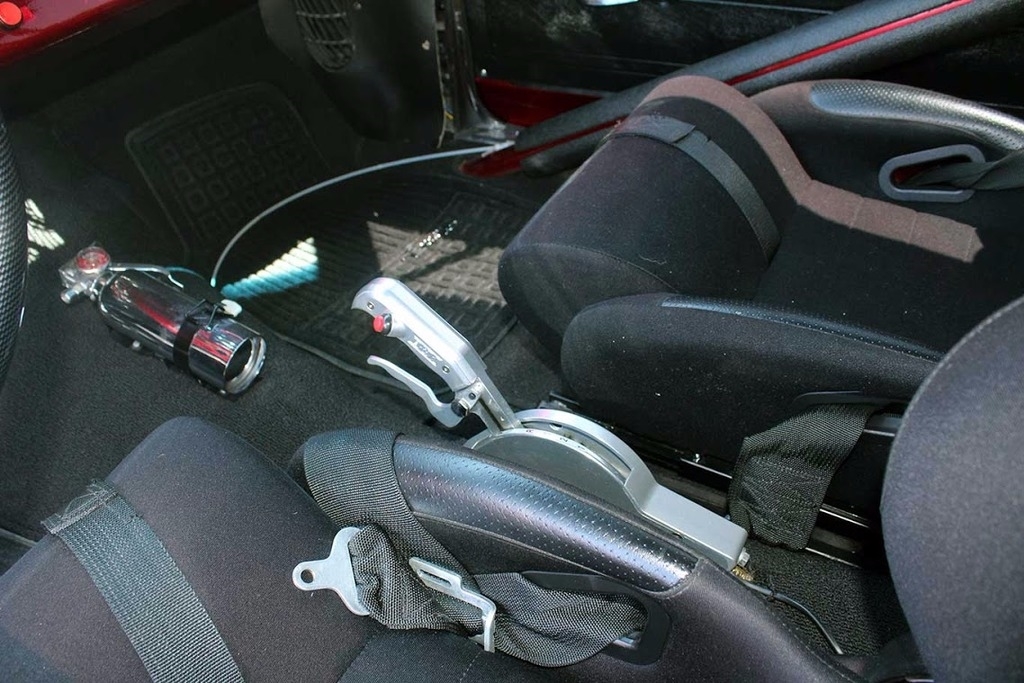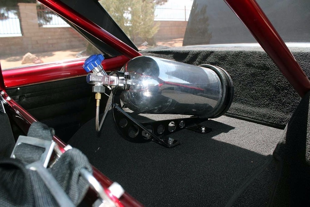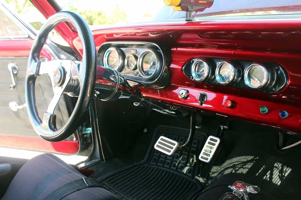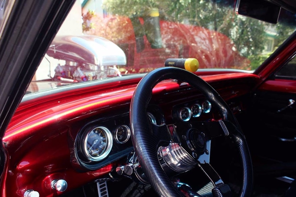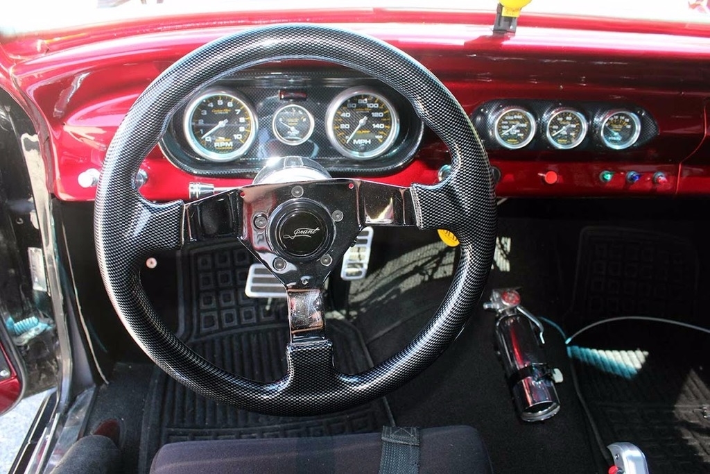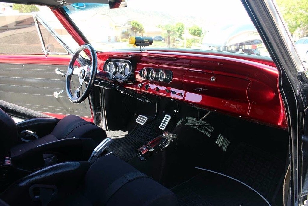The interior of this 1964 Pro Street Nova II is equally impressive. The candy red dash features carbon fiber ultra light Auto Meter gauges, chrome knobs, and a carbon fiber Grant steering wheel with a chromed tilt wheel steering column. Dual bucket seats with harness seat belts, and a full roll cage in chrome and candy red complete the interior of this Pro Street Nova II.
