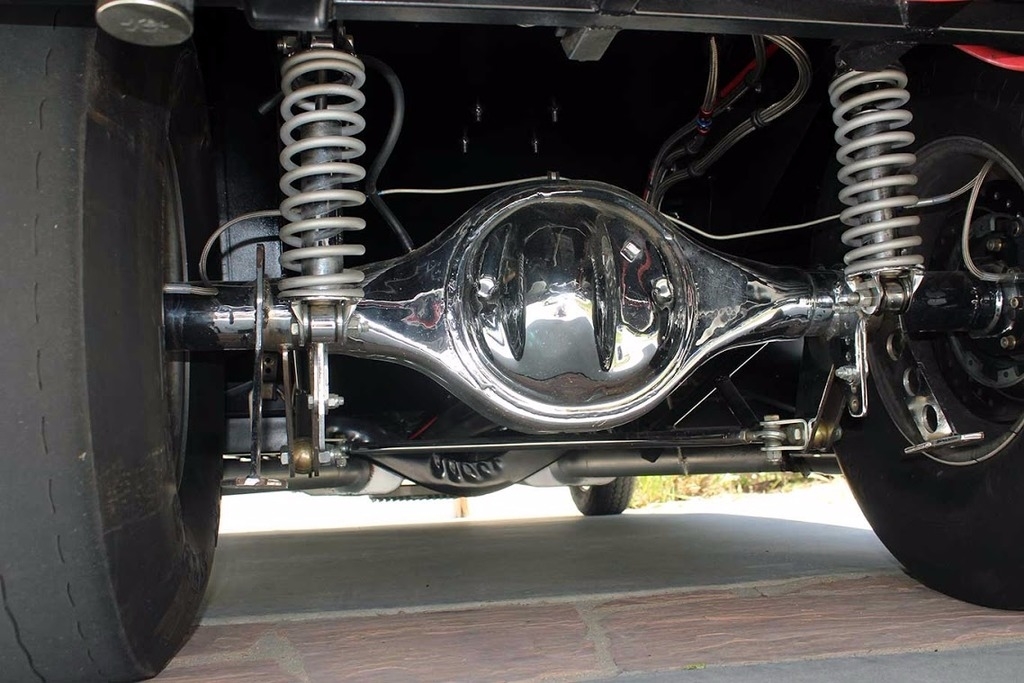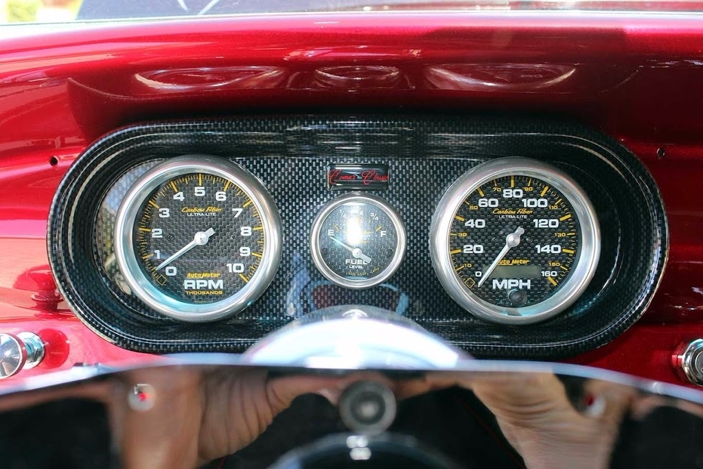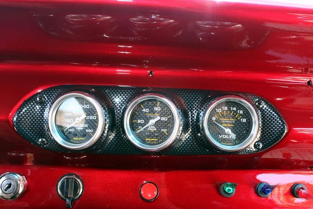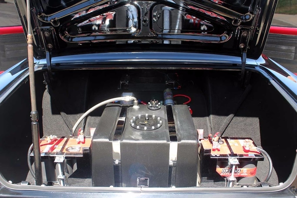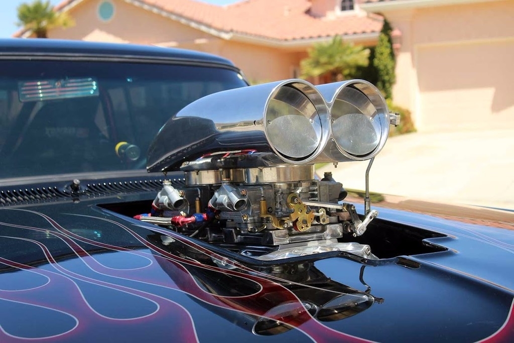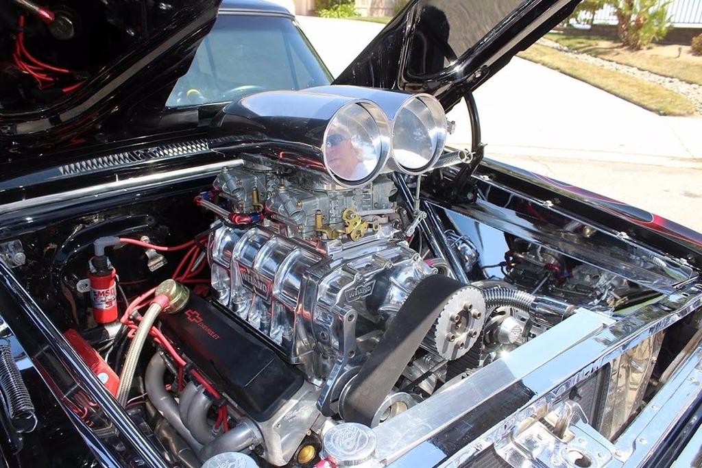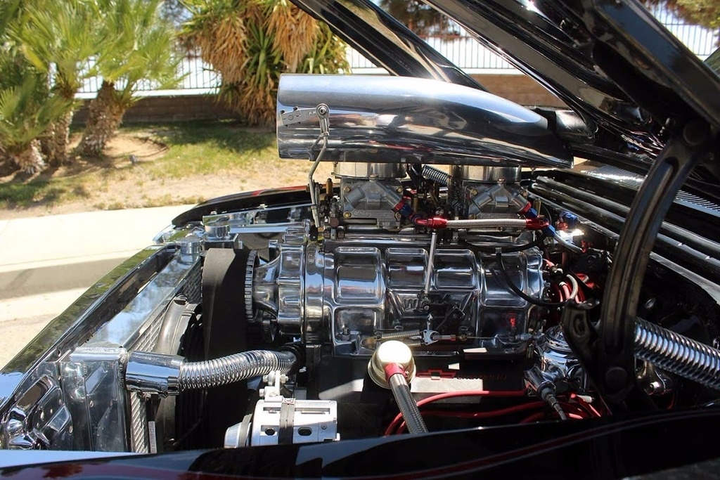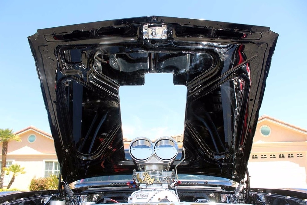 Under the hood is a balanced and blueprinted 355 small block Chevrolet with a 4 bolt main that has a steel crank, brand new Edelbrock aluminum heads, dual Holley 600 carburetors, and a shop-fresh polished Weiand 6-71 blower that is capable of 500+ horsepower. The custom built power glide transmission has a 2500 stall converter, with an Auto Meter Pro Shift Lite installed on the dash.