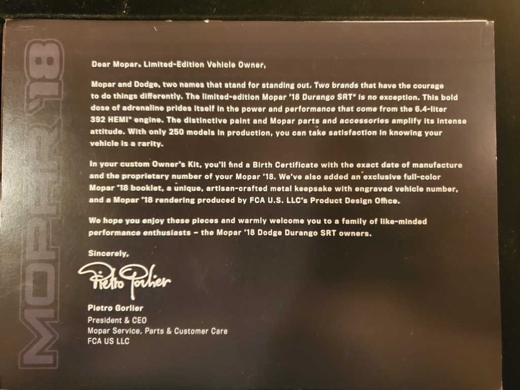 Window Sticker and All the Mopar 18 Limited Edition Paperwork, Badging, Metal