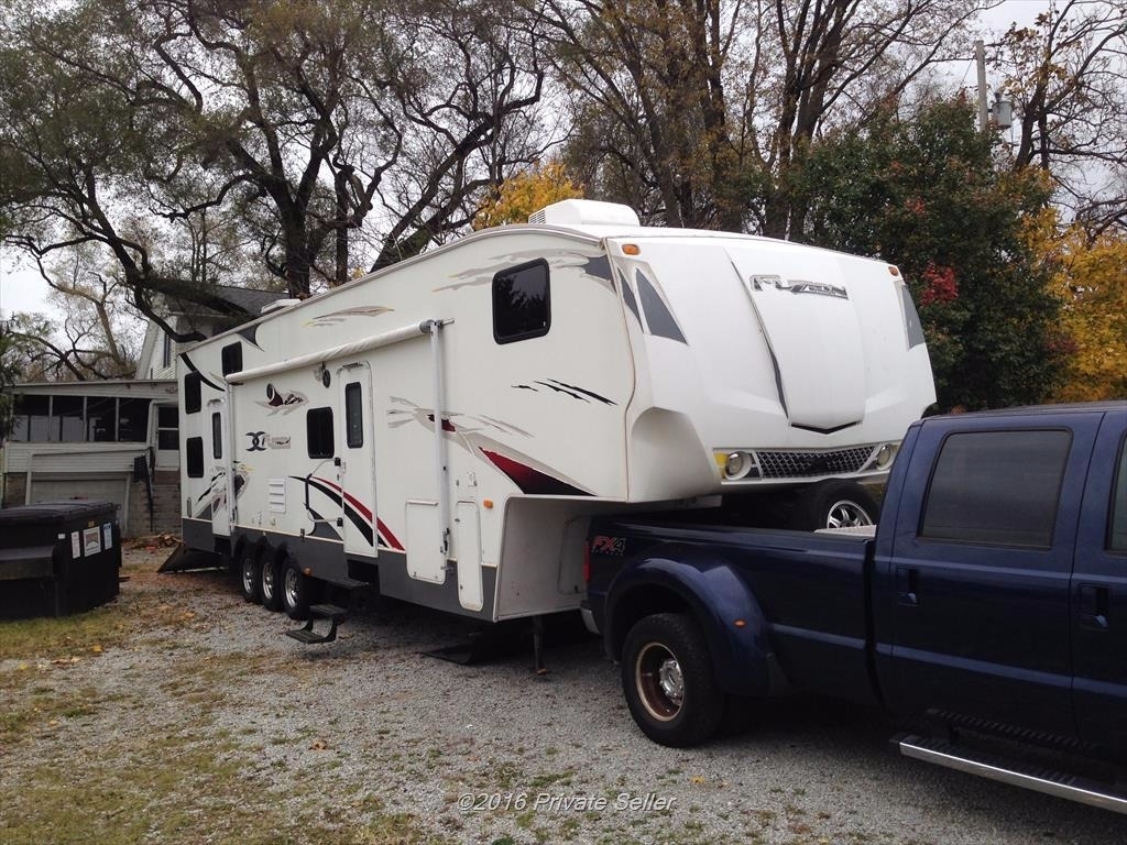 This Keystone Fuzion is a great 38-foot Toy Hauler. It has a beautiful white decal exterior with an interior wood finish accented with earth toned colors. It will sleep 6, making it perfect for any size family with both big and small children. This Toy Hauler would also make a great hunting camper.