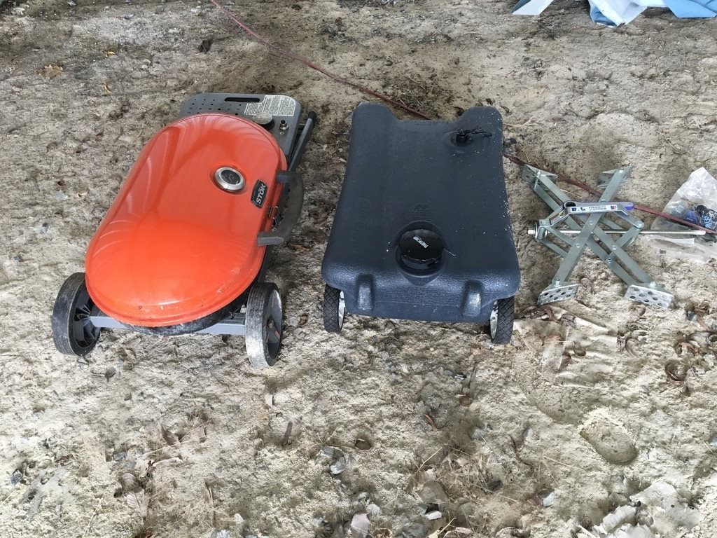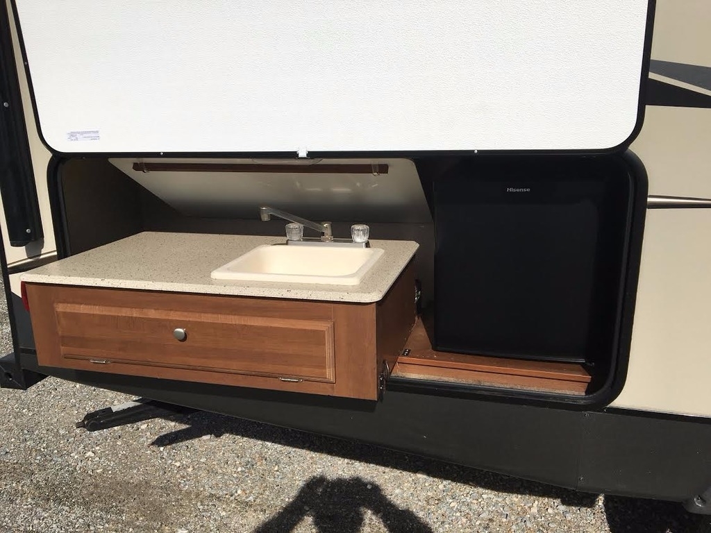 refrigerator, sink, and stove top outdoors. The stove has not been used; the