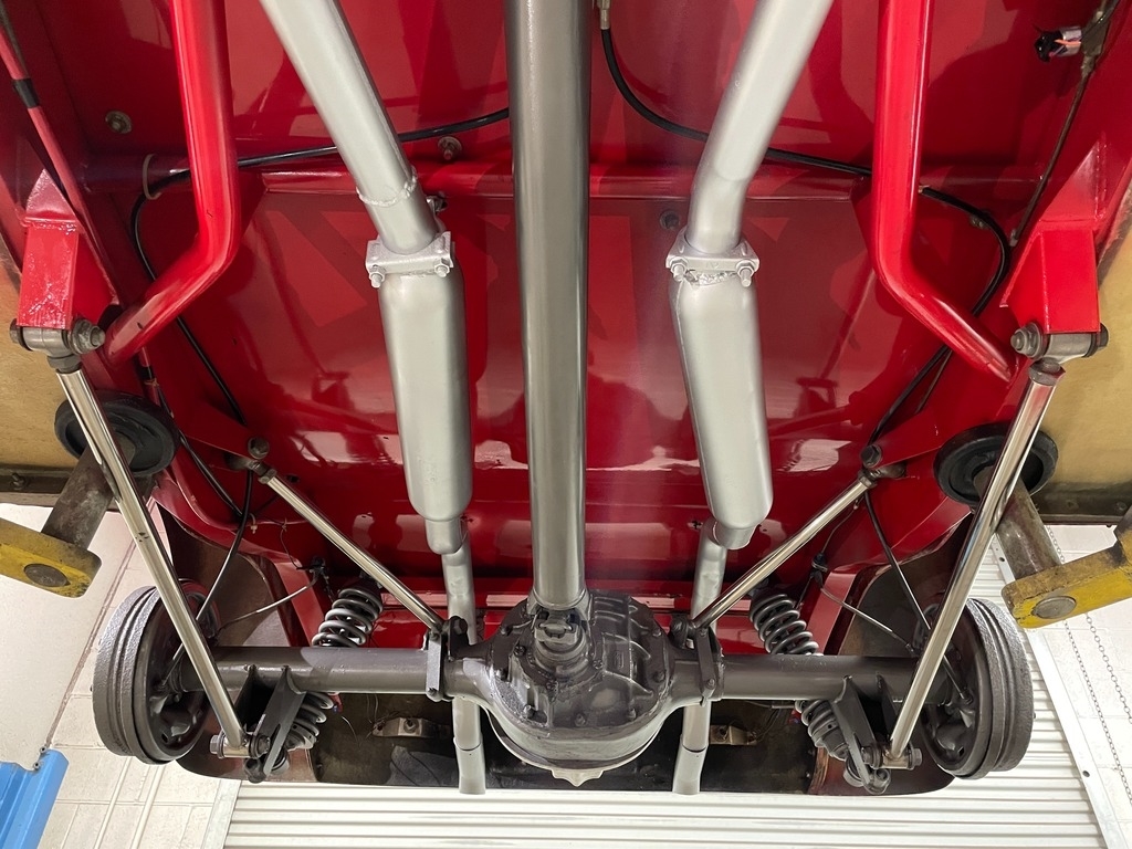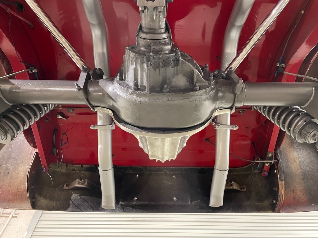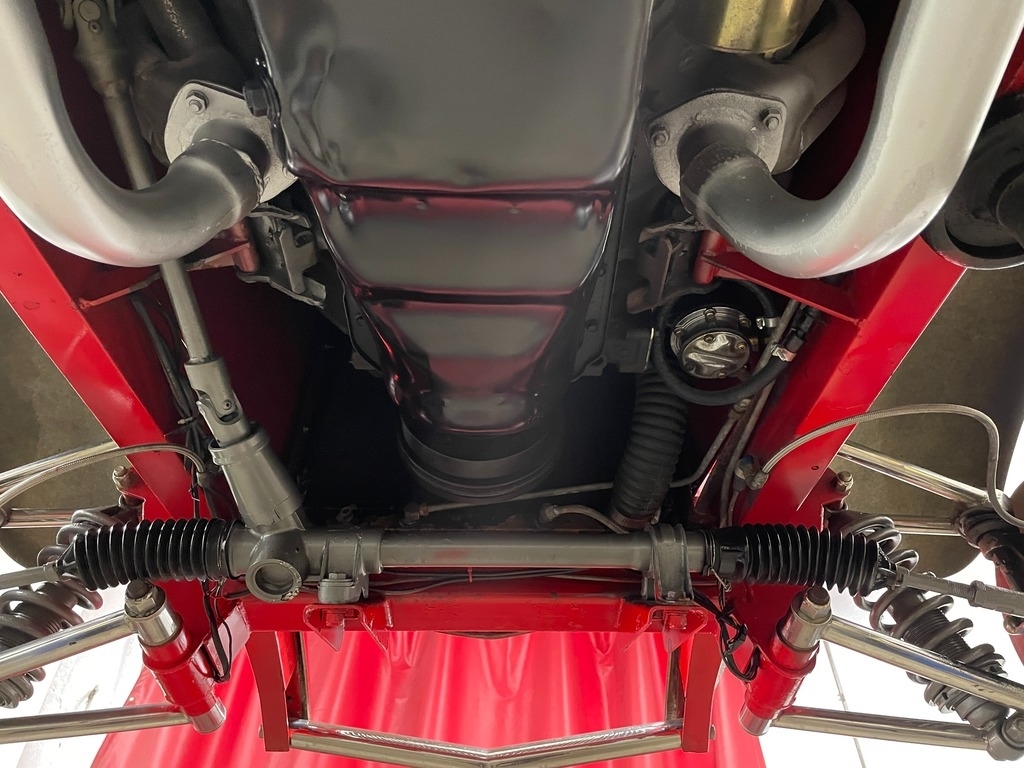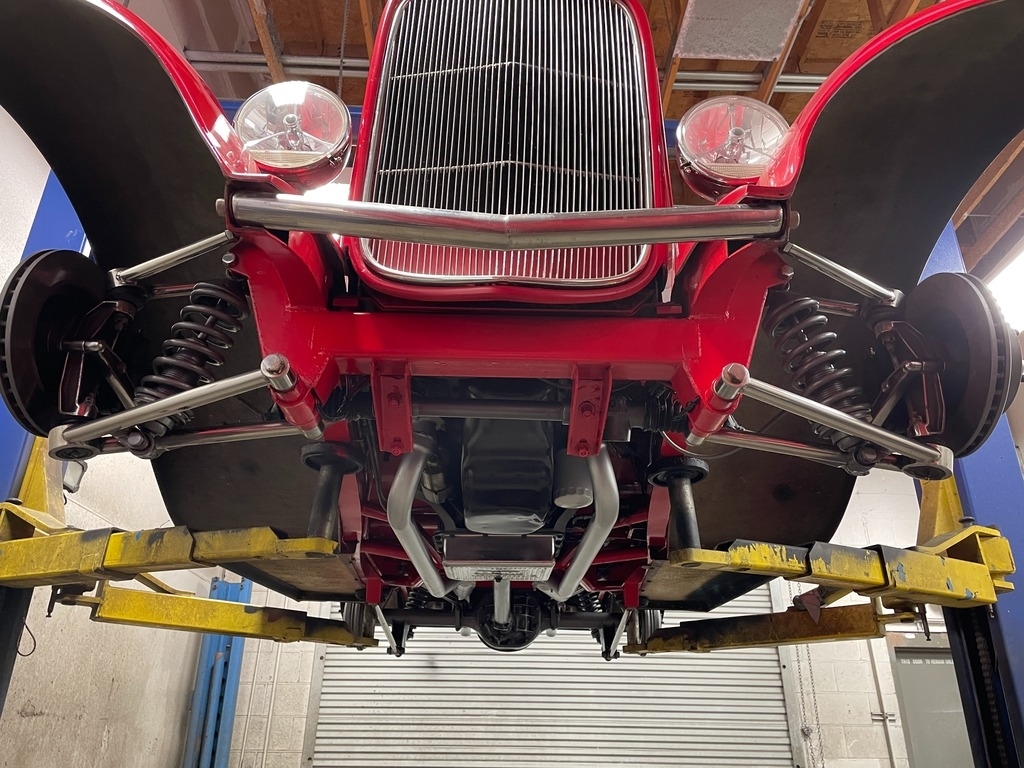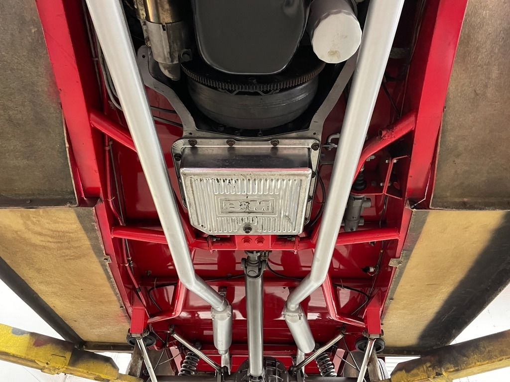 This car is chopped and channeled and built Downs Manufacturing. It has a 350ci engine with aluminum heads, TH400 auto transmission, 9 inch Ford rear with four link and coil overs. IRS front suspension, power windows, door poppers and suicide doors, Weld wheels and new carb, radiator and alternator.