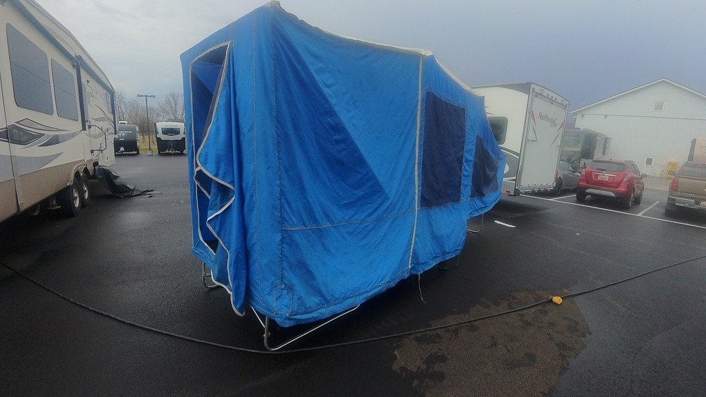Speaking of the canvas on this camper is Fair to good. No tears or repairs.