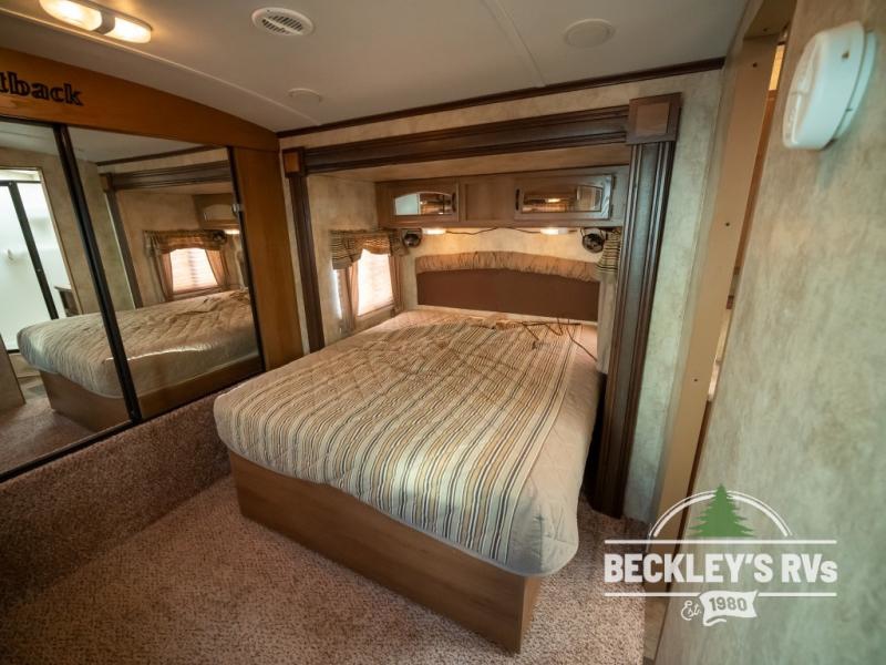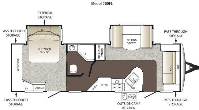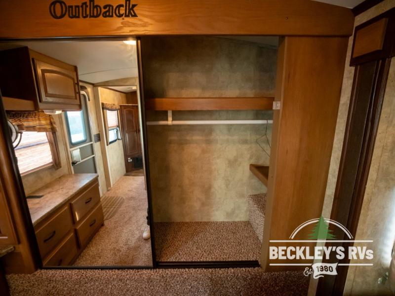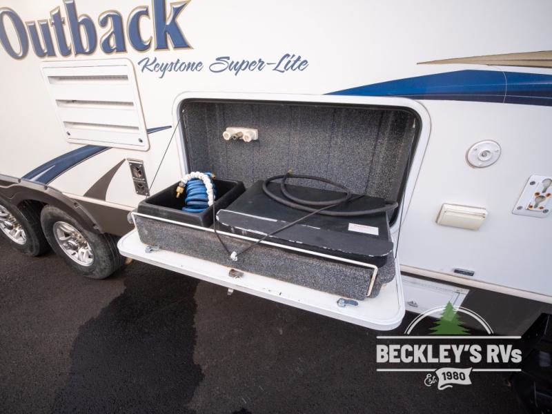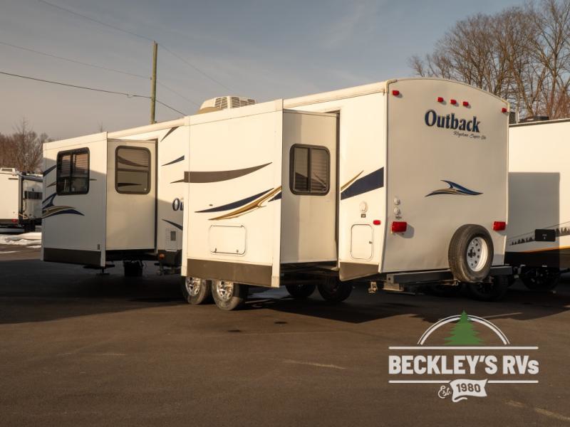 Double Slide Outback Trailer by Keystone w/Rear Queen Bed Slideout, Overhead Storage, Exterior Storage, Rear Pass-Thru Storage, Wardrobe, Dresser, Private Bedroom Entry, Side Aisle Bath w/Angle Shower, Sink & Toilet, Linen Cabinet, Ent. Center/Pantry, Refrigerator, 3 Burner Range, Double Kitchen Sink, King U-Dinette Slideout, Front Sofa w/Pass-Thru Storage, Outside Camp Kitchen and More!