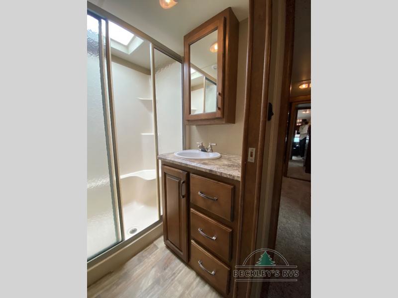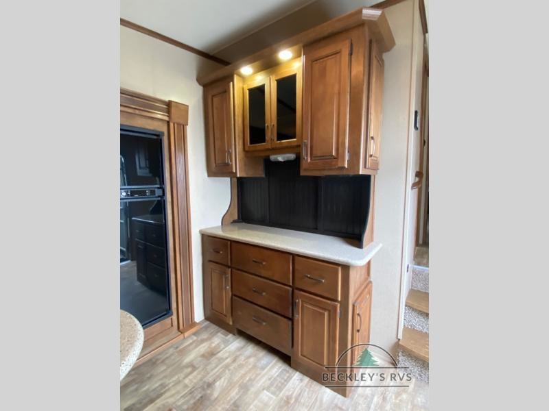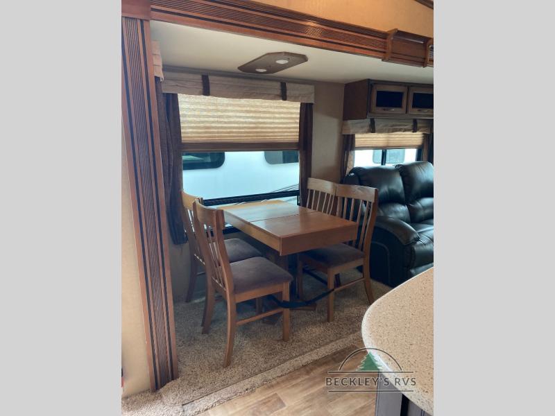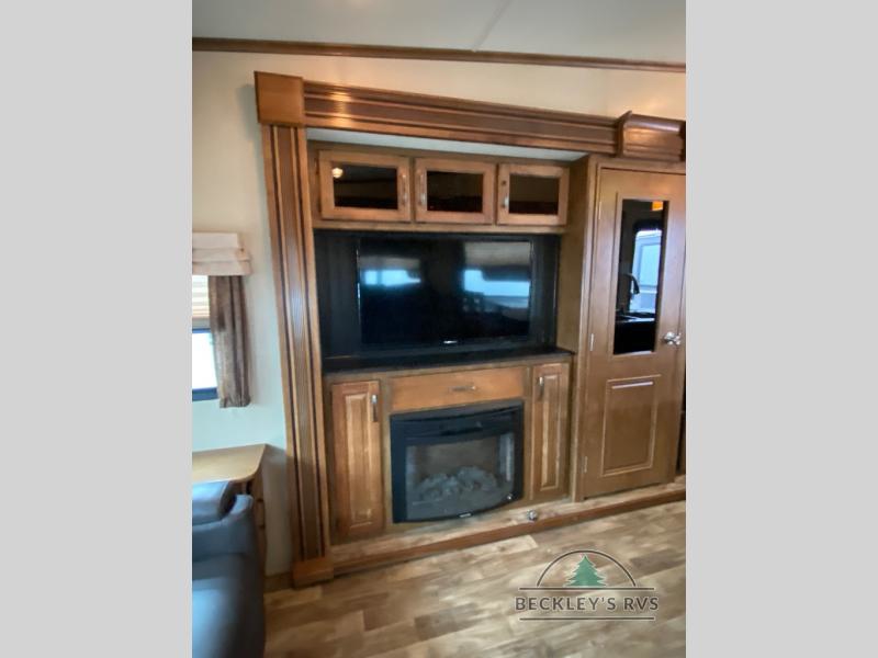 There is a free standing dinette and theater seating to the left of the entry door in a slide out. A hutch with overhead is located straight in from the main entry door. The slide on the opposite side of the room features a refrigerator, pantry, three burner range with overhead storage, pantry and 39" TV entertainment center with fireplace below.