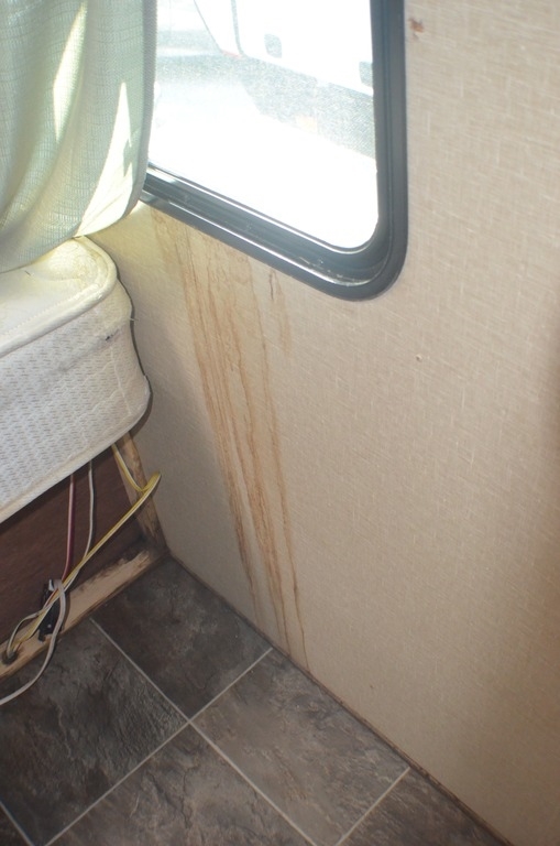 THERE WAS A LEAK AT THE FRONT CAP AND WATER DAMAGE WAS INTO THE WALL OF THE BEDROOM .