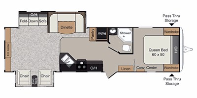 Continue right into the front bedroom area that offers a quiet place to relax and rest. There is a convenience center on the curbside wall, a queen size bed with dual wardrobes, and an overhead cabinet for your things.
