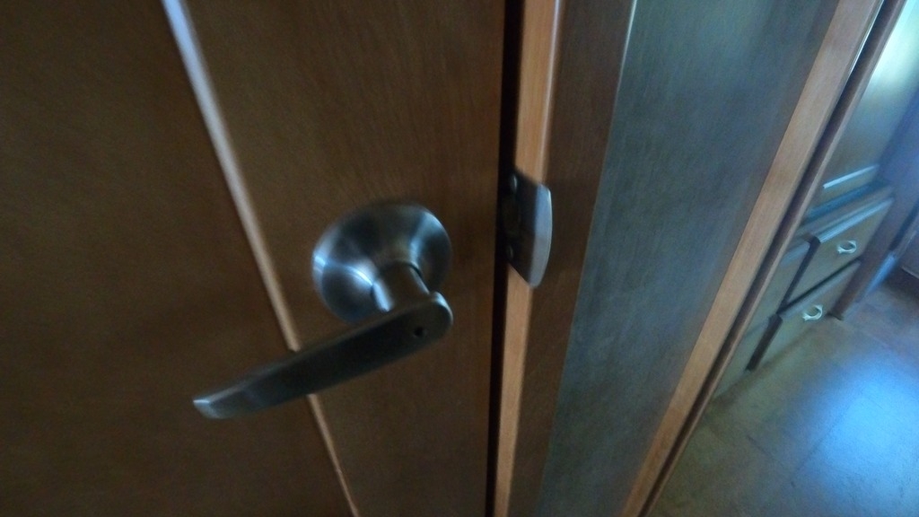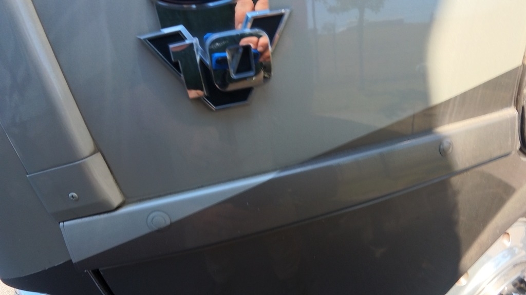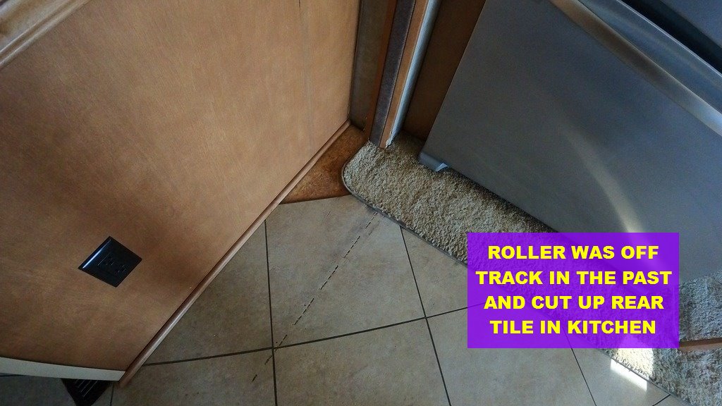 When the coach came into us there was a misalignment of the left side slide. There is tile missing on the floor at rear of slide where misalignment tore the vinyl.