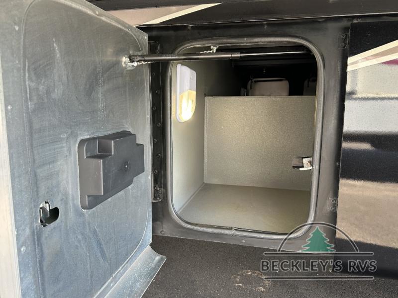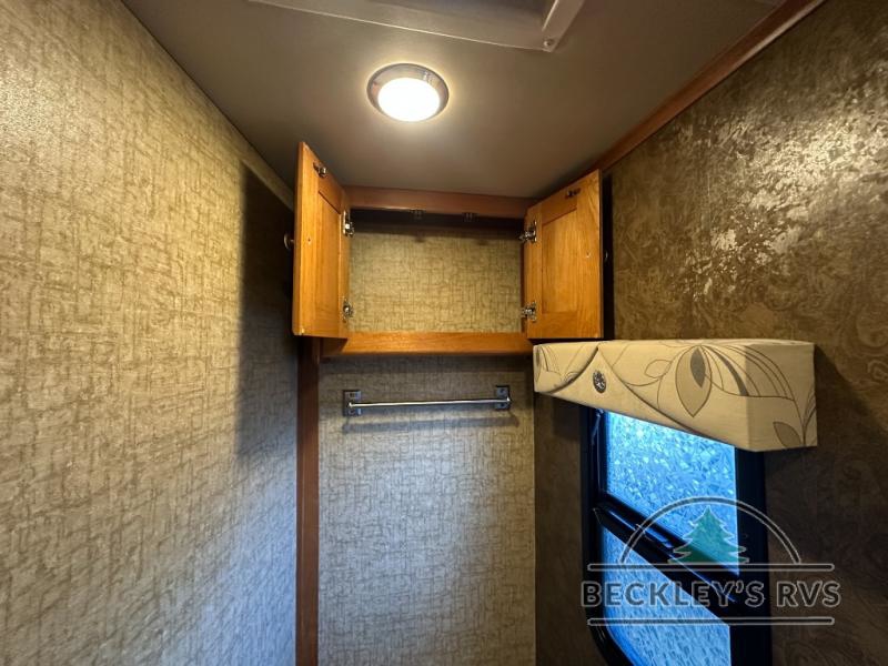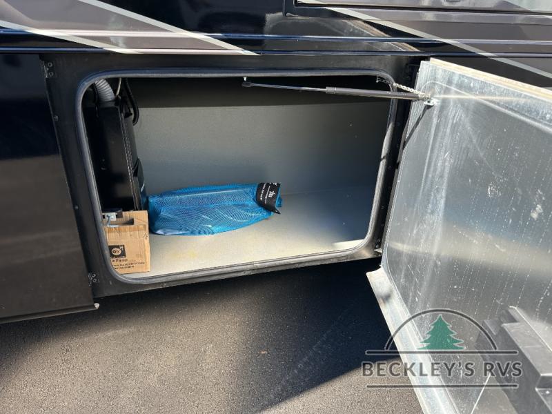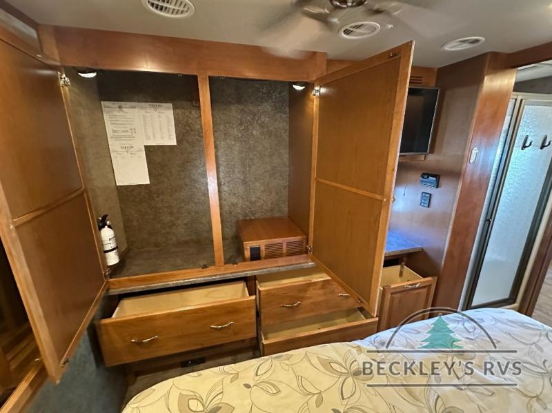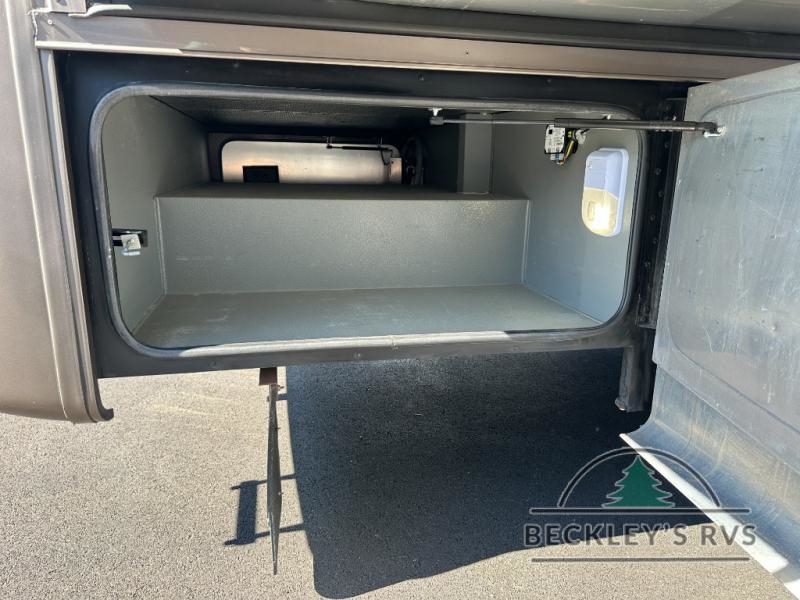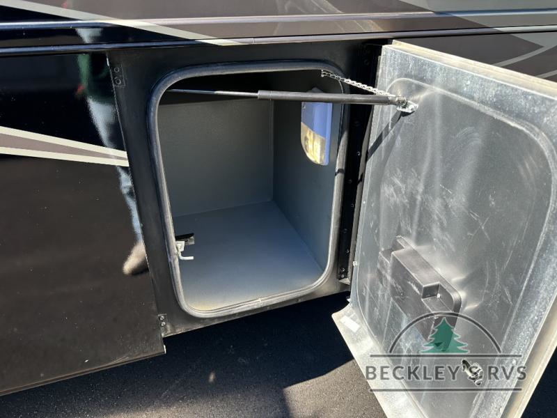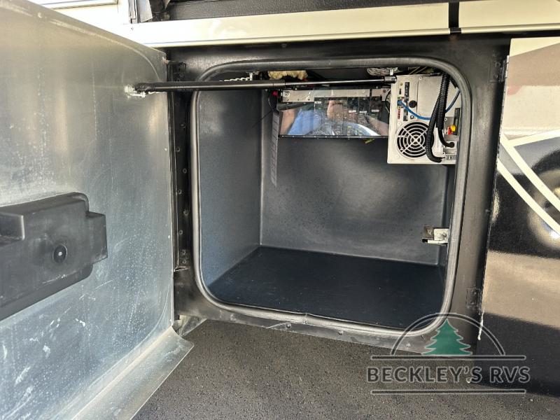 Continue on back to the master bedroom where you will enjoy a relaxing retreat with plenty of foot traffic space. There is a king bed slide out including nightstand on both sides of the bed. A rear wall storage space, and opposite the bed is a wardrobe with drawers, and vanity with TV, plus so much more!
