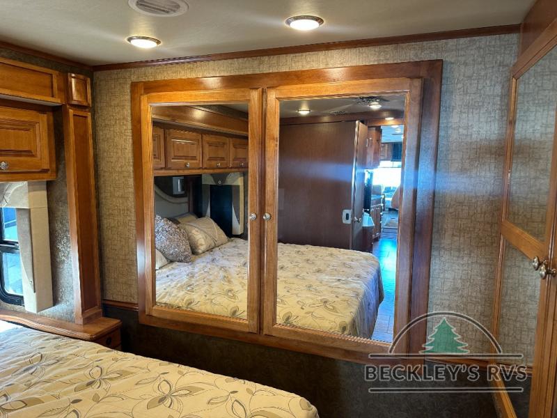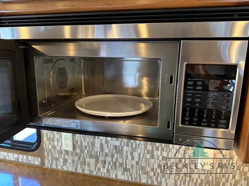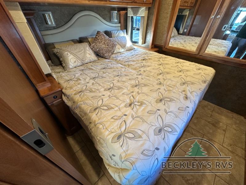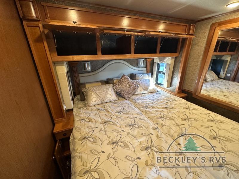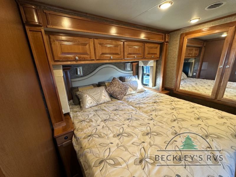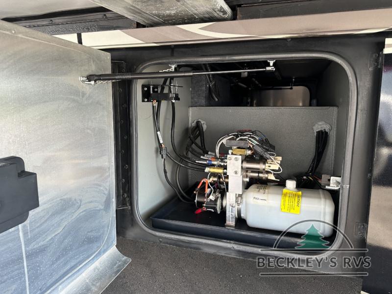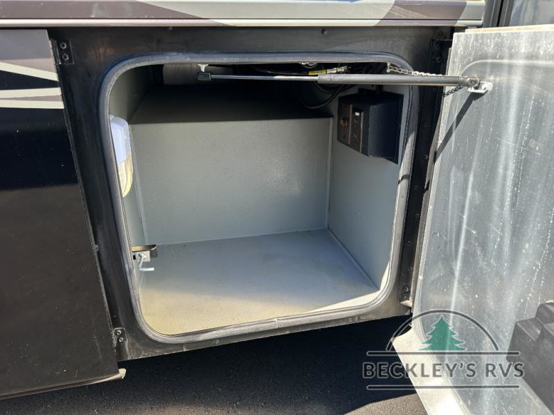 Continue on back to the master bedroom where you will enjoy a relaxing retreat with plenty of foot traffic space. There is a king bed slide out including nightstand on both sides of the bed. A rear wall storage space, and opposite the bed is a wardrobe with drawers, and vanity with TV, plus so much more!