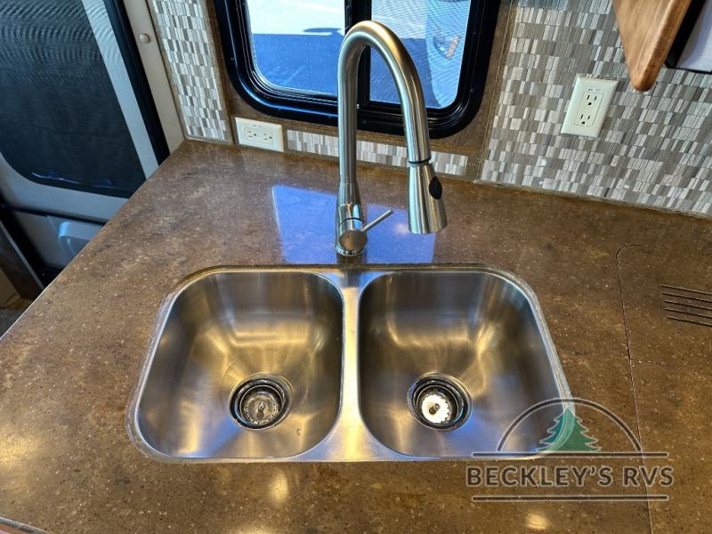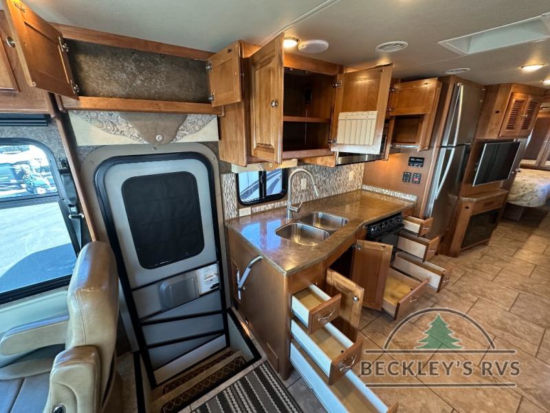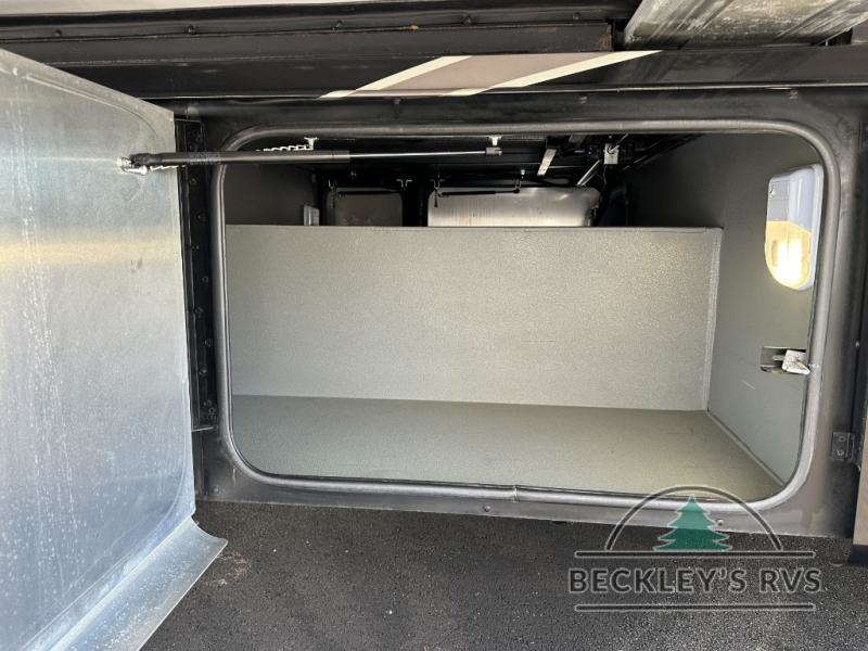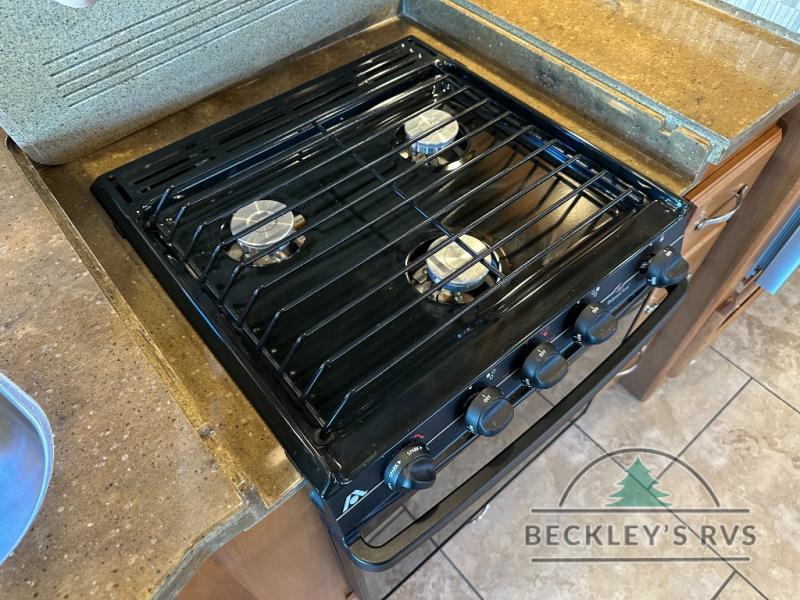 Enter the side door behind the passenger seat or add an optional driver side door. Once inside take a look back and see just how spacious the interior is. There is a double sink, three burner range with microwave overhead, refrigerator, and pantry on the curb side just beyond the entry door. So, cooking your favorite gourmet meals will be a cinch!