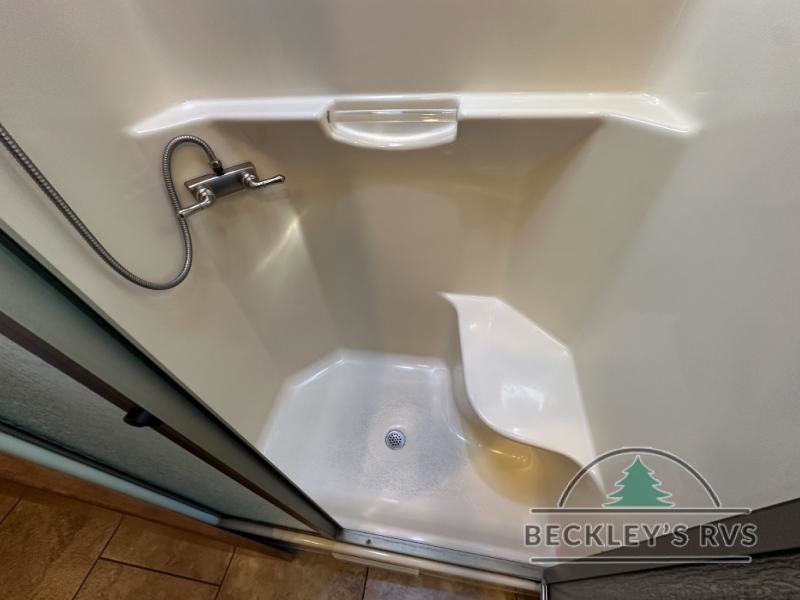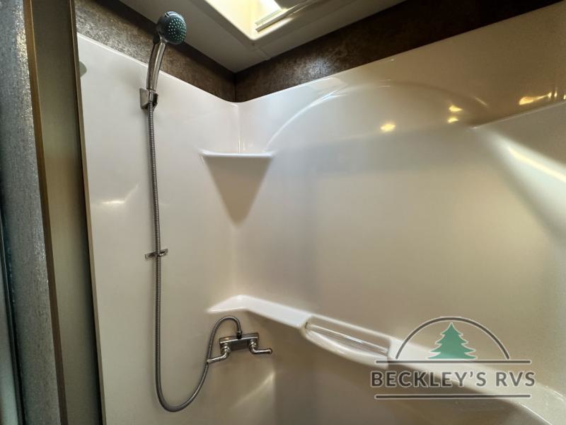 A sliding door blocks off the bedroom and bathroom space from the front living area. When you enter you will find a shower on your right and private toilet and vanity with sink on your left including some overhead storage cabinets.