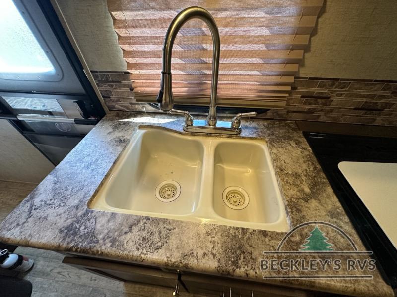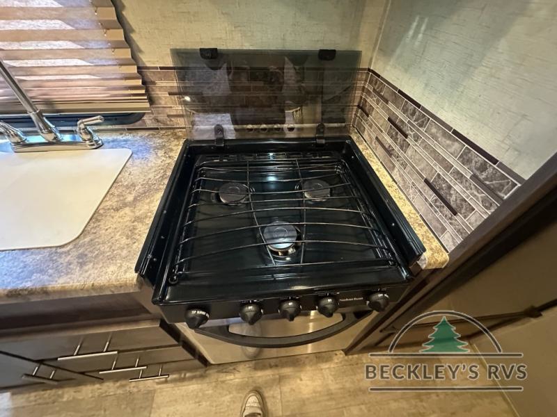 As you enter the trailer to the left there is a double kitchen sink, three burner range, and refrigerator. On the opposite side of the trailer you will find a slide with a u-dinette and a pantry. Along the front of kitchen area you will find an entertainment center.