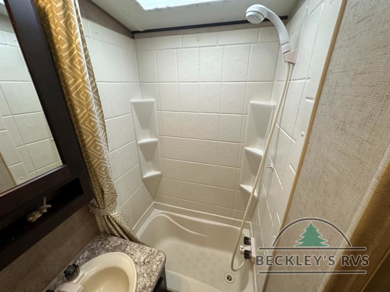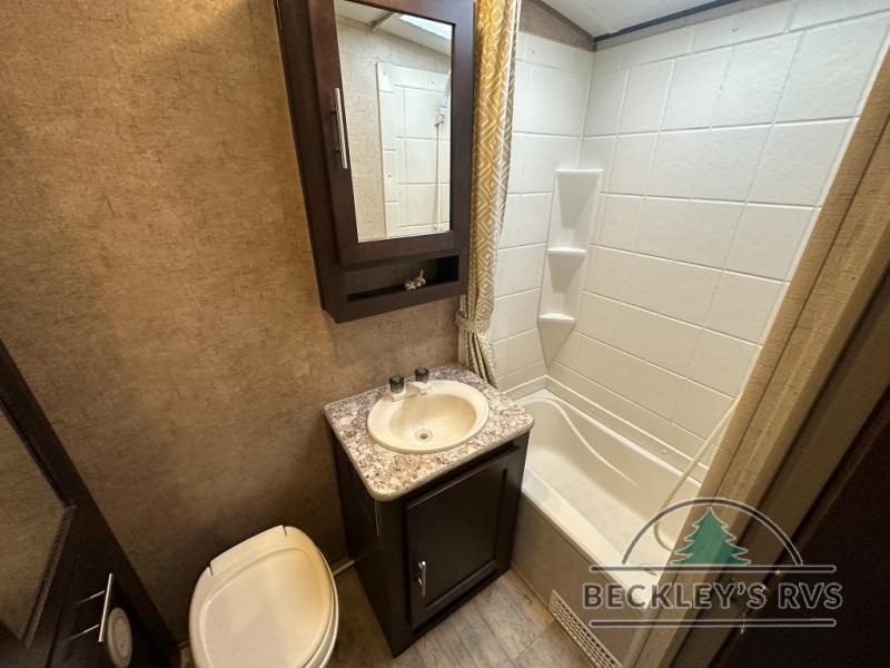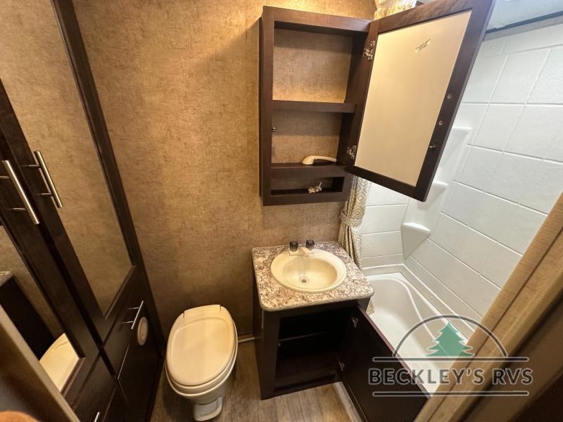 The bathroom is located in the rear of the trailer. Inside the bathroom you will find a tub/shower, sink, medicine cabinet, toilet and bath closet which you can easily store towels or toiletries.