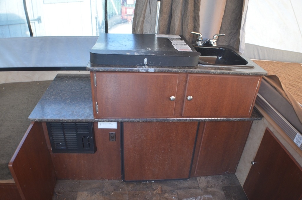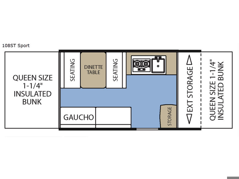 It's time to camp comfortably above ground in this Clipper Sport pop-up folding camper.  Model 108ST Sport is easy to tow and easy to setup.  You will be able to get a good night's rest on one of the two queen size insulated tent end beds after hanging out with everyone at the campsite.   There is a booth dinette and a gaucho providing a place to relax, eat or even sleep for two more family members or friends.  You are sure to enjoy cooking meals and washing your dishes inside when the weather isn't cooperating outdoors.  Come see why this pop-up camper is a great for a family of 6!