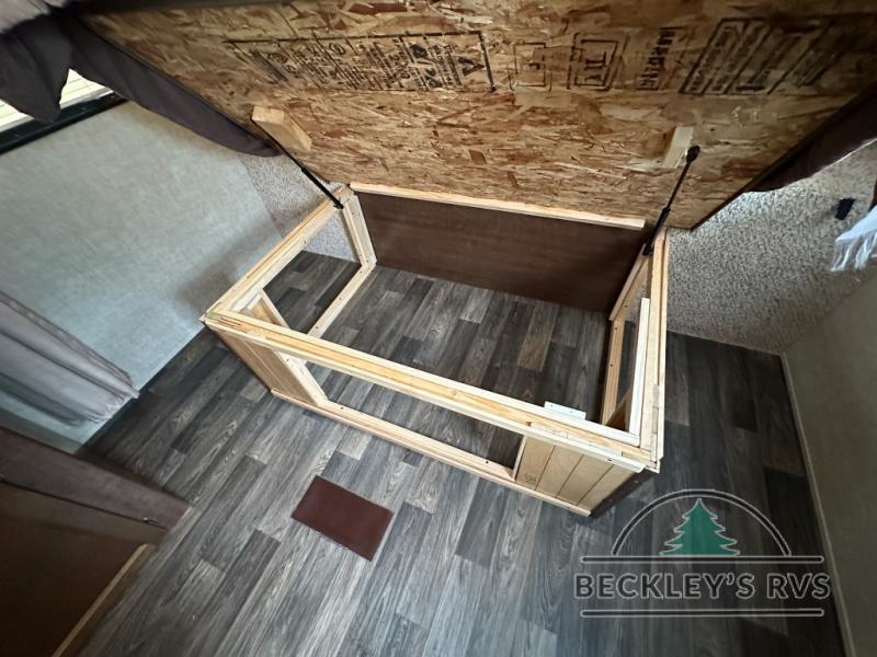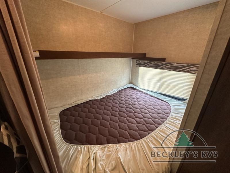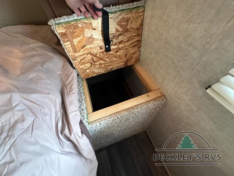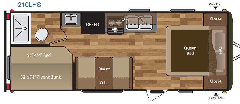 Enter model 210LHS and notice the front queen bed to the right of the door. There are bedside closets on either side, plus overhead storage as well.