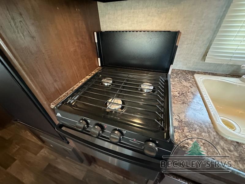 To the left find a booth dinette also with storage above. On the opposite side there is a double sink, three burner range, and refrigerator. Plus, find plenty of storage cabinets above for dishes and things, and lower cabinets and drawers too.