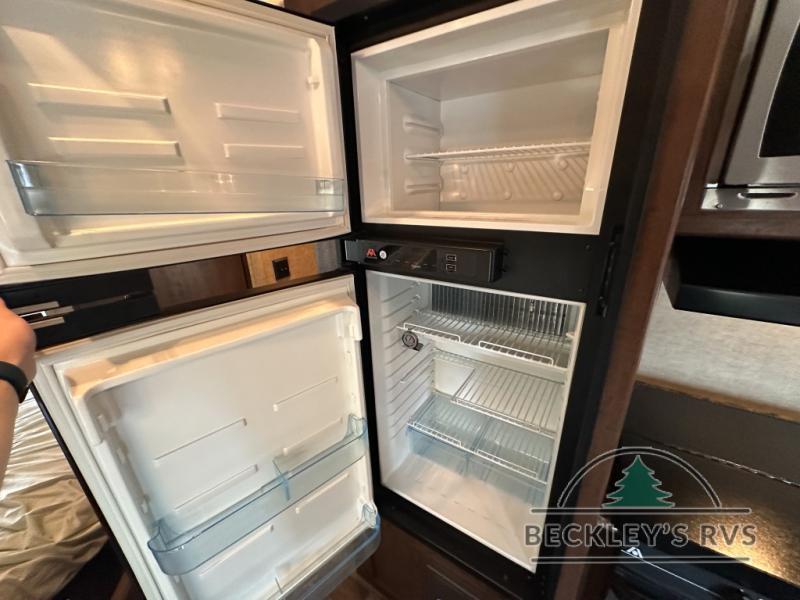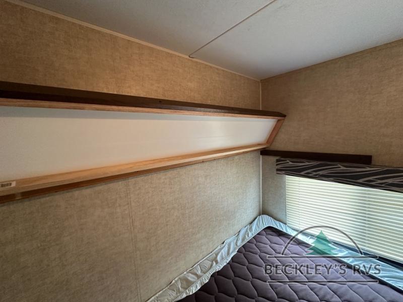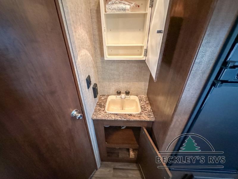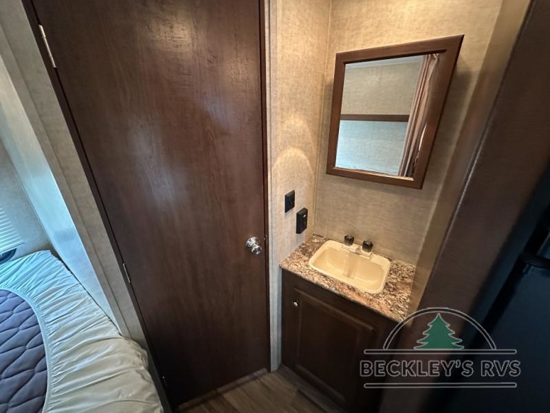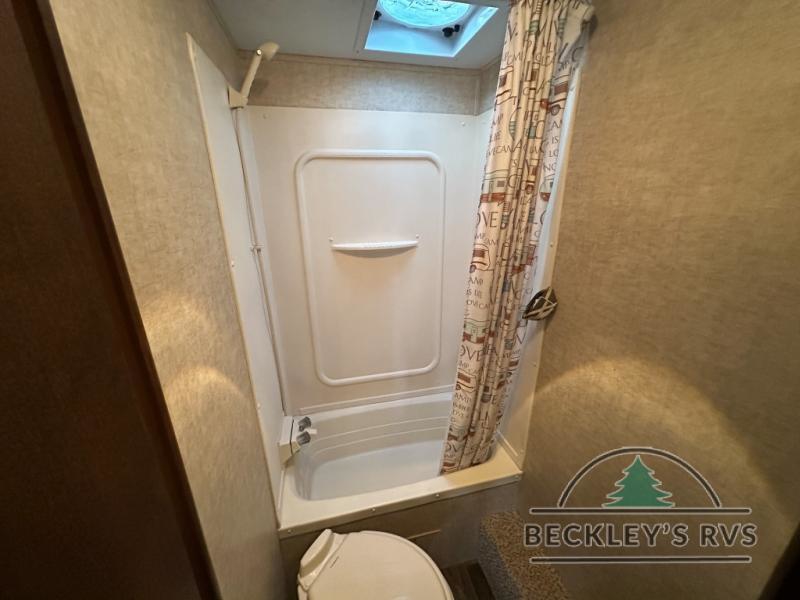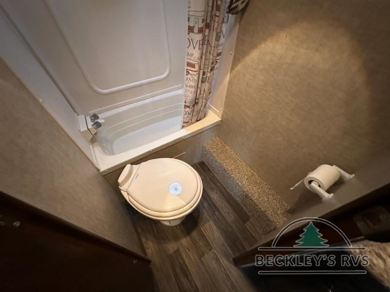 The rear right corner offers a convenient private tub/shower and toilet, with separate sink just outside the door. The left corner features a 52" x 74" bed with 32" x 74" pivot bunk above.