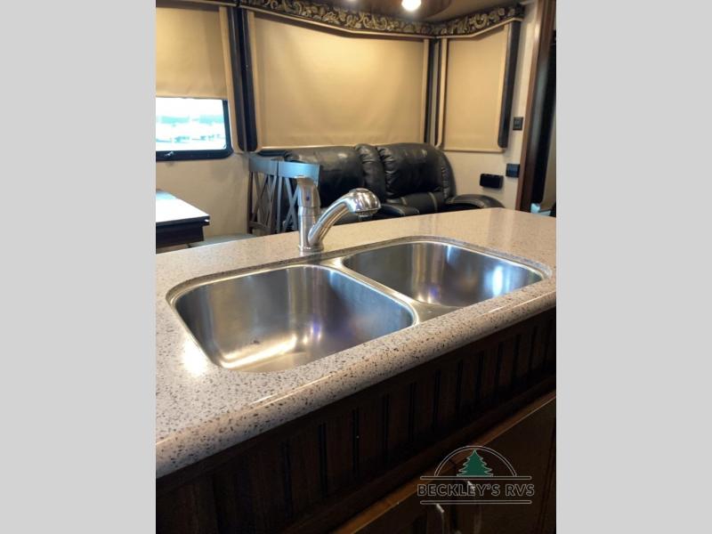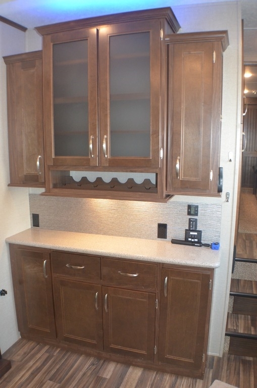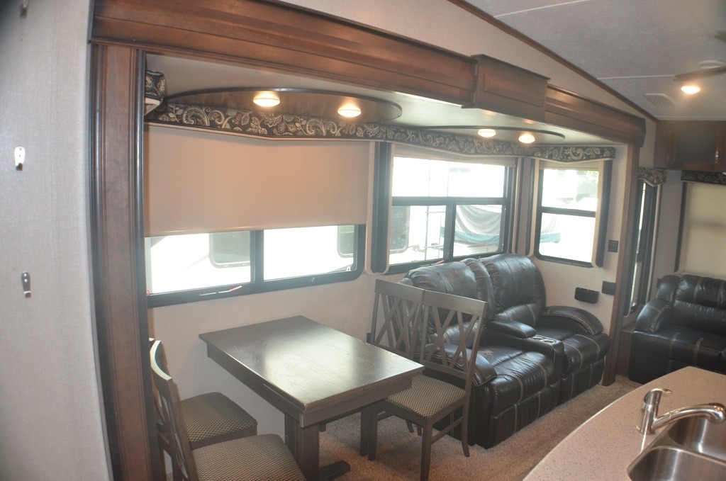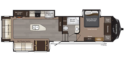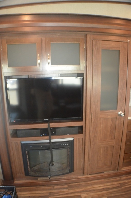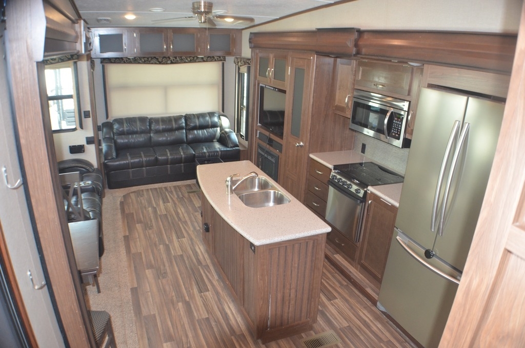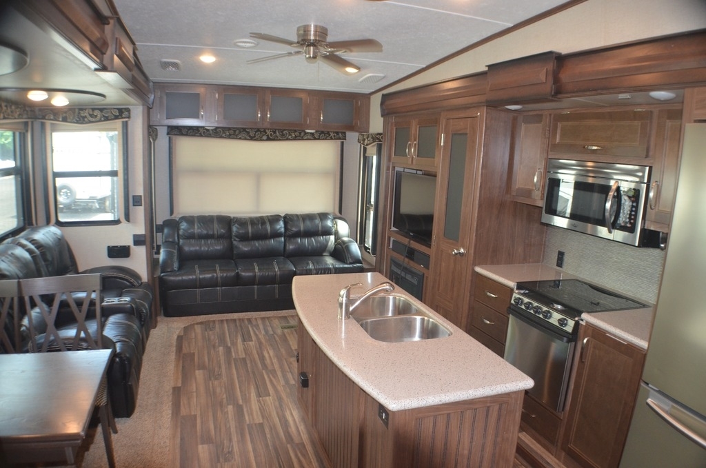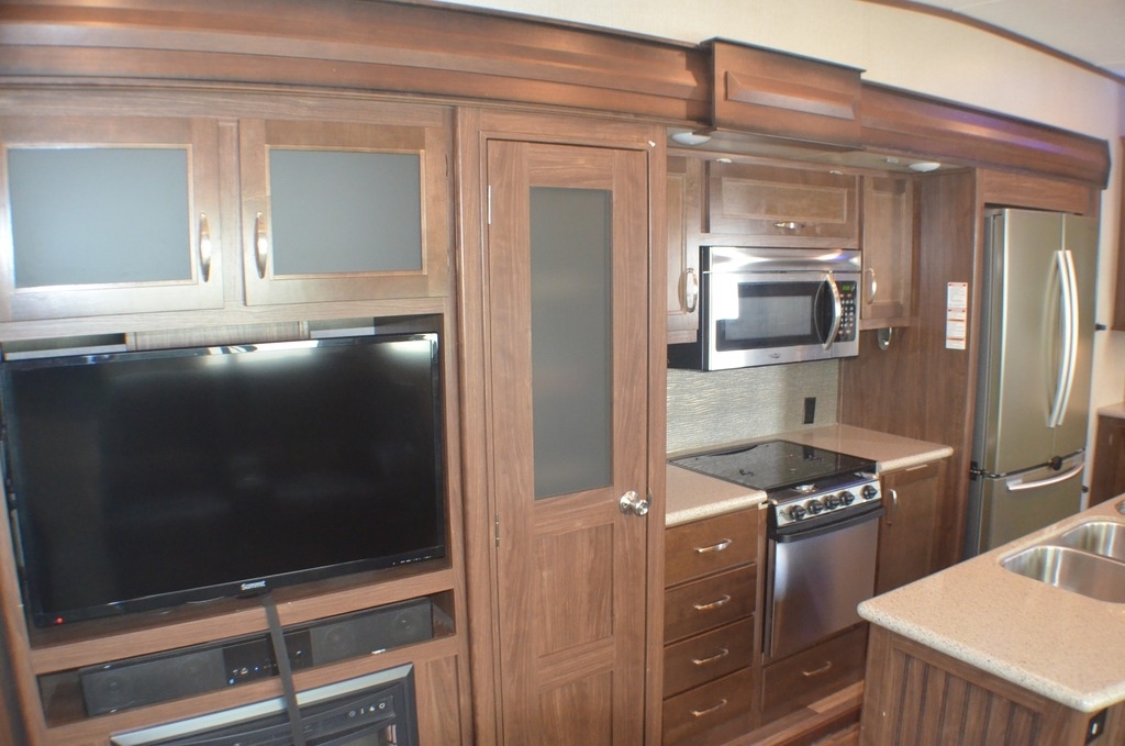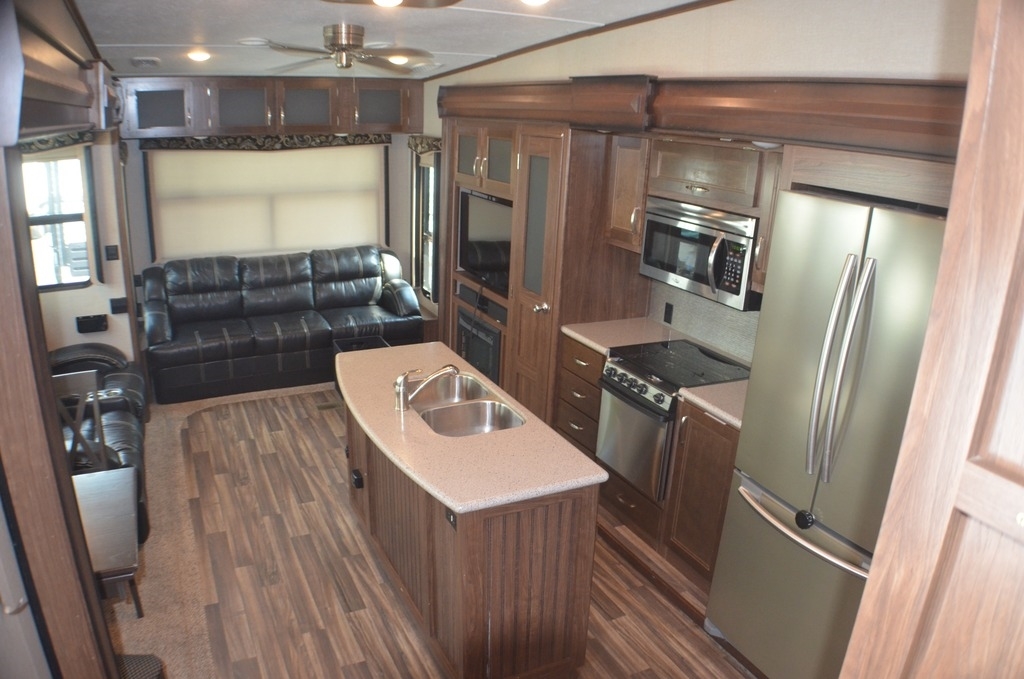 As you enter notice the coat closet to your right and how open the main living space is with dual opposing slides fully extended to your left. There is a slide out dinette with four chairs and optional theater seating to the left of the door. Along the rear wall find a hide-a-bed sofa with overhead cabinets that stretch the entire width of the fifth wheel. Adjacent to the hide-a-bed there is an entertainment center slide with HDTV and optional fireplace below. This slide also features a pantry for food storage needs, counter space, a three burner range with overhead residential microwave oven, and a residential refrigerator. A convenient kitchen island offers additional storage and counter space, plus it is where you will find the double sink for cleaning up. A nice hutch is located along the interior wall straight in from the entry door for storage.