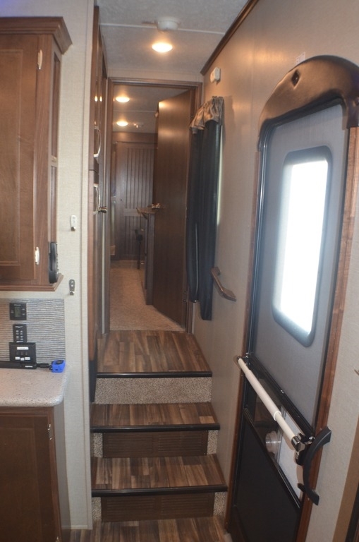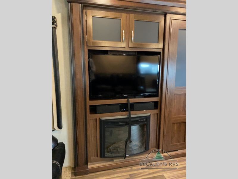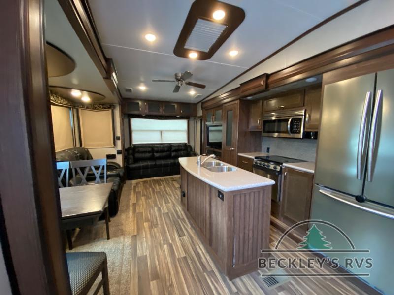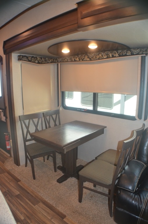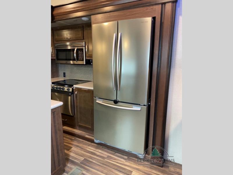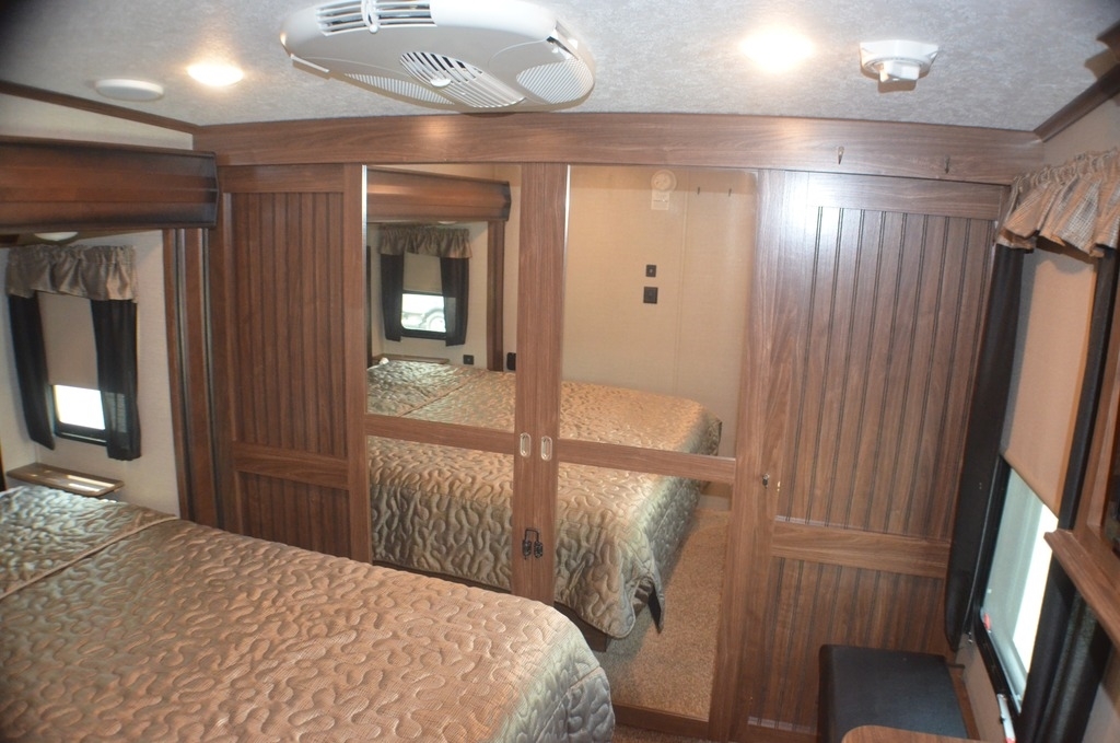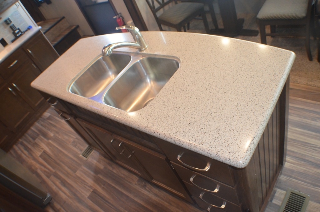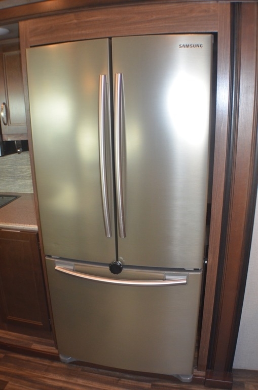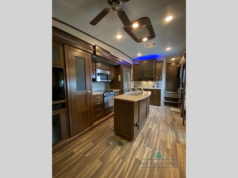 As you enter notice the coat closet to your right and how open the main living space is with dual opposing slides fully extended to your left. There is a slide out dinette with four chairs and optional theater seating to the left of the door. Along the rear wall find a hide-a-bed sofa with overhead cabinets that stretch the entire width of the fifth wheel. Adjacent to the hide-a-bed there is an entertainment center slide with HDTV and optional fireplace below. This slide also features a pantry for food storage needs, counter space, a three burner range with overhead residential microwave oven, and a residential refrigerator. A convenient kitchen island offers additional storage and counter space, plus it is where you will find the double sink for cleaning up. A nice hutch is located along the interior wall straight in from the entry door for storage.