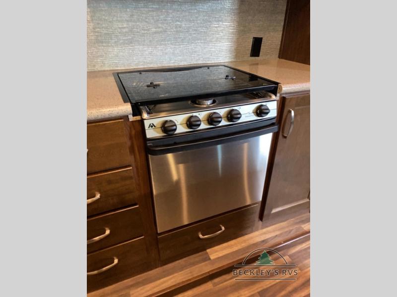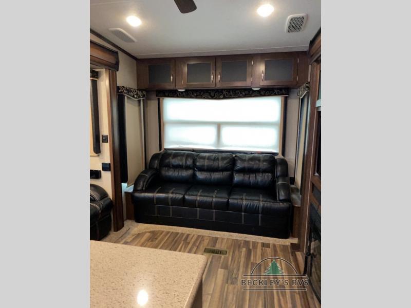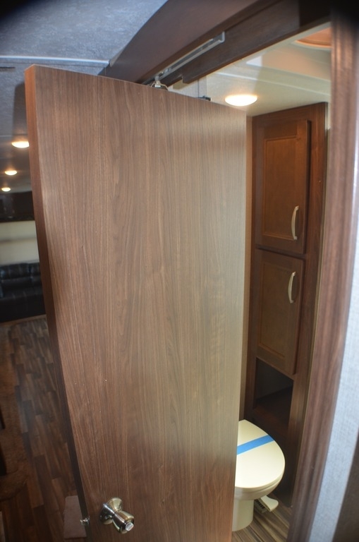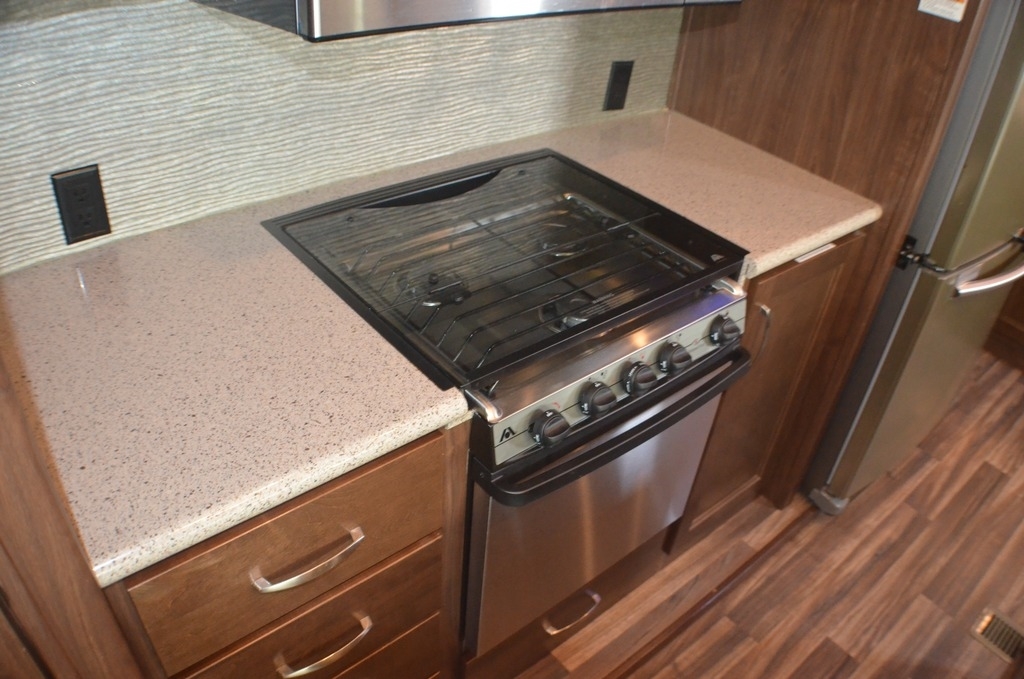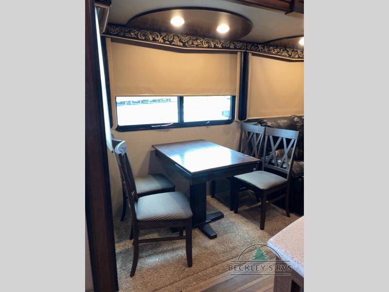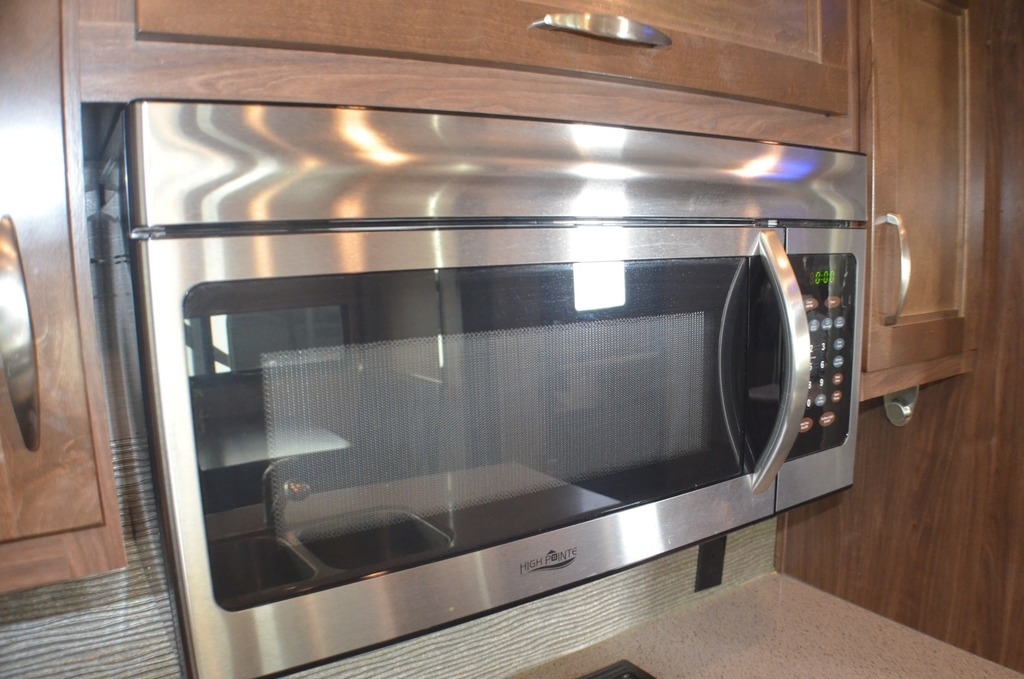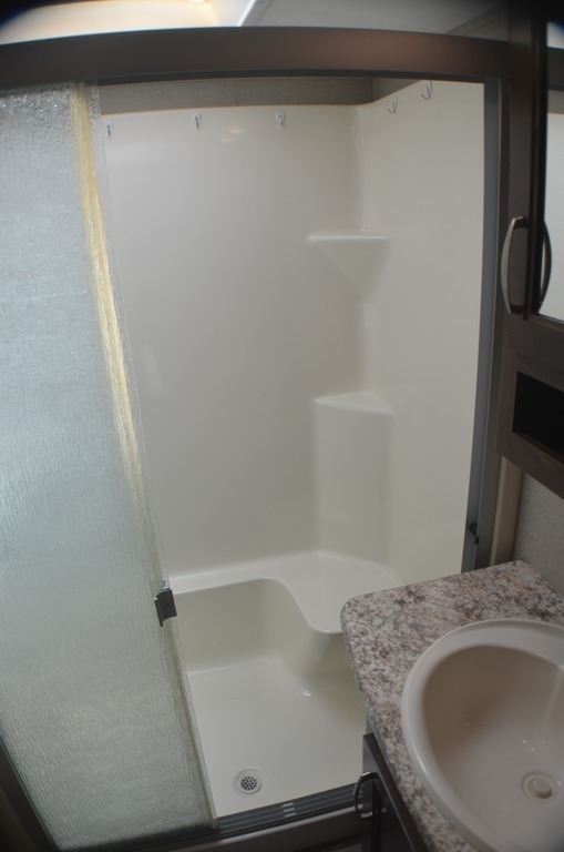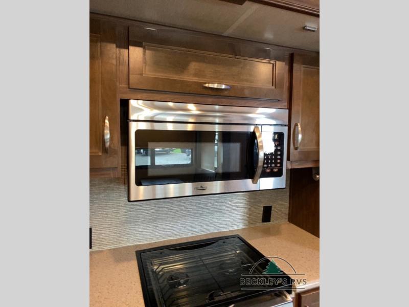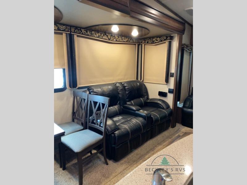 As you enter notice the coat closet to your right and how open the main living space is with dual opposing slides fully extended to your left. There is a slide out dinette with four chairs and optional theater seating to the left of the door. Along the rear wall find a hide-a-bed sofa with overhead cabinets that stretch the entire width of the fifth wheel. Adjacent to the hide-a-bed there is an entertainment center slide with HDTV and optional fireplace below. This slide also features a pantry for food storage needs, counter space, a three burner range with overhead residential microwave oven, and a residential refrigerator. A convenient kitchen island offers additional storage and counter space, plus it is where you will find the double sink for cleaning up. A nice hutch is located along the interior wall straight in from the entry door for storage.
