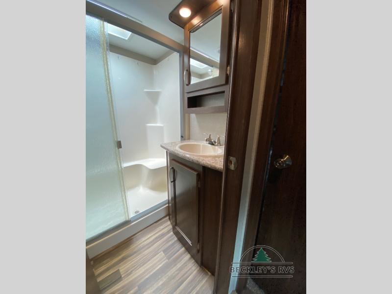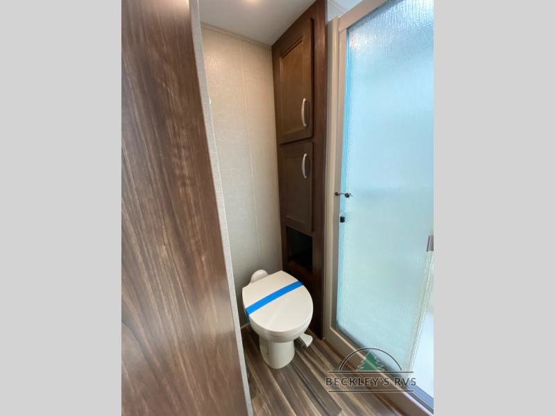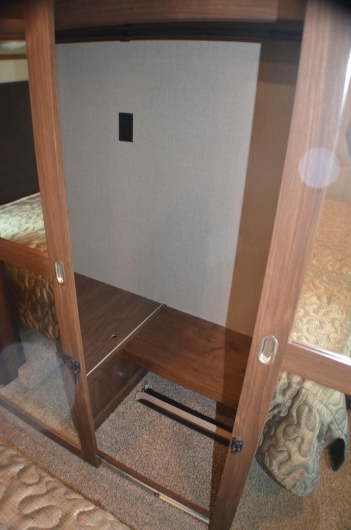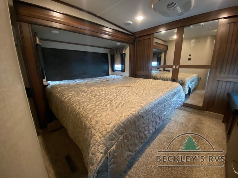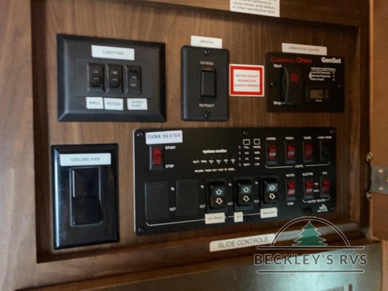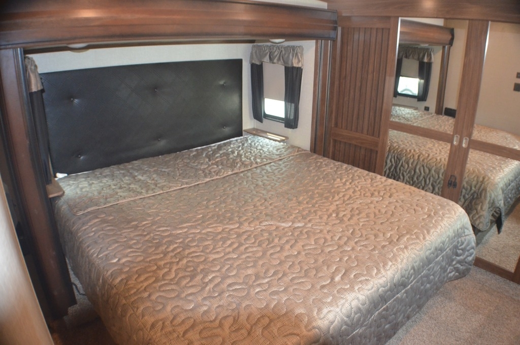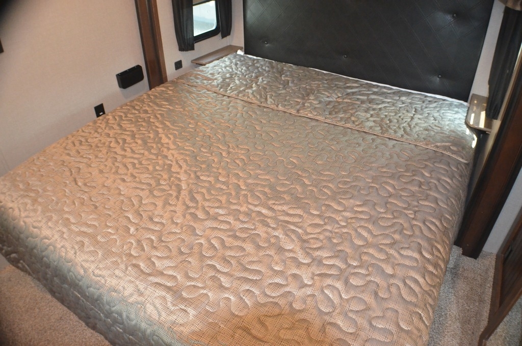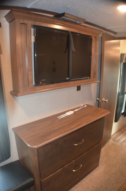The front master bedroom is behind the door at the head of the hall and provides a welcome retreat with a queen or optional king bed slide including storage beneath the bed. A dresser is found opposite the bed along the curb side wall along with a 32" HDTV, a seating area, and the front wall features a wardrobe with washer and dryer prep, plus so much more!