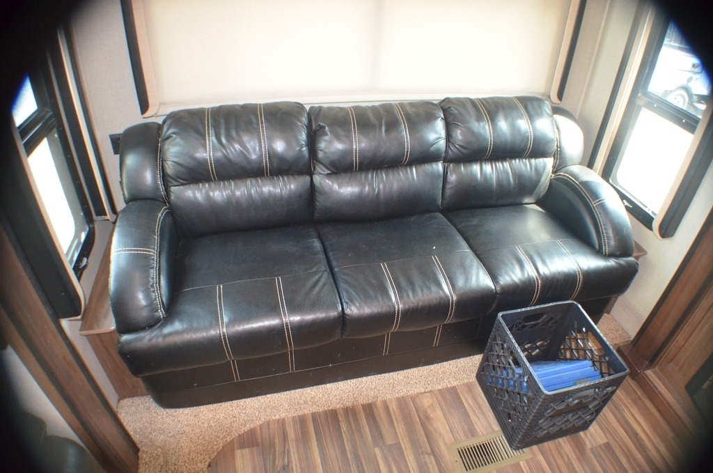 Long, King sleep sofa along the back wall in very good condition.