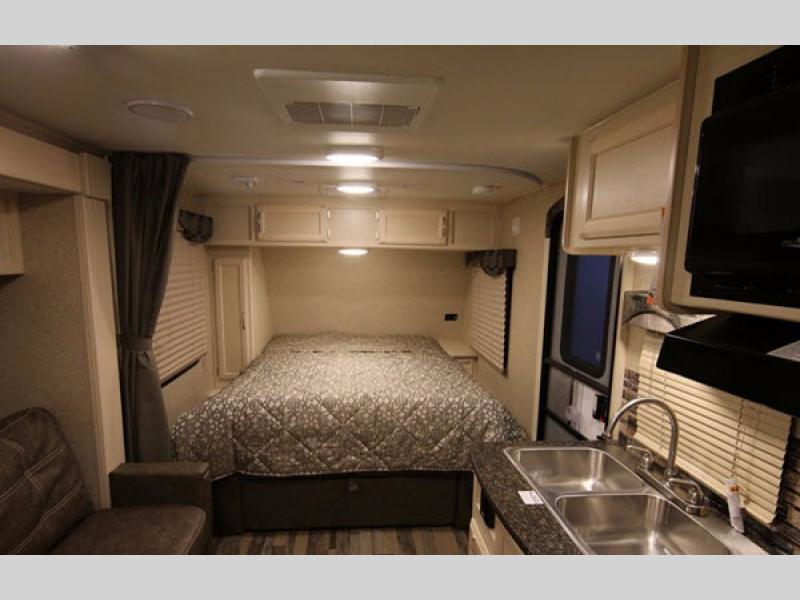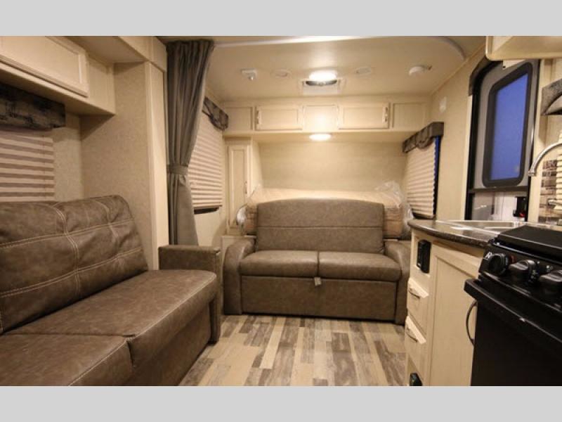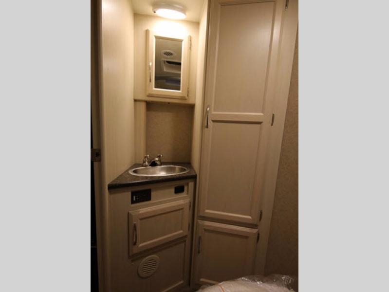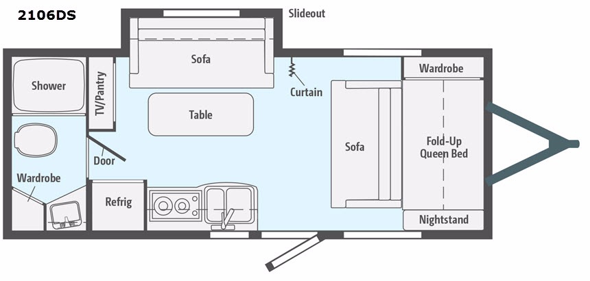 The second sofa is on a slide along the road side wall. Above the sofa there is overhead storage which helps to keep your things neat and tidy. You can enjoy meals at the sofa as there is also a table in front of it. Adjacent to the slide is a TV and pantry. On the opposite side of the trailer you can prepare your favorite meals using the two burner range and microwave oven, plus clean up easily at the double kitchen sink. You will also find a refrigerator for your perishables.