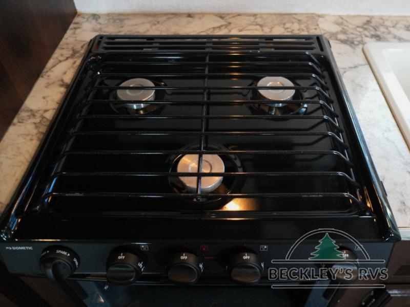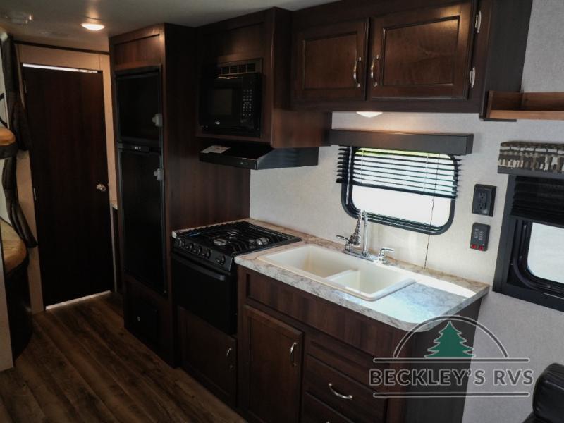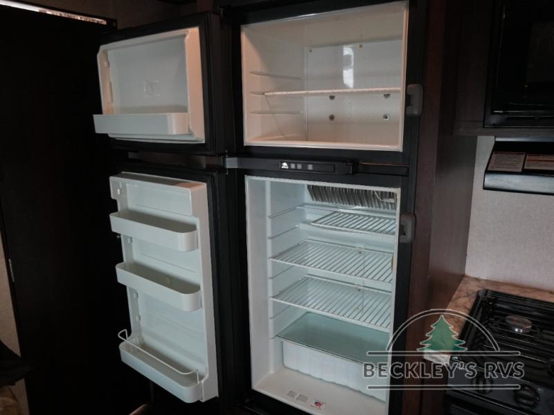 As you enter the travel trailer, to the left there is a dinette. Across from the dinette you will see a refrigerator, three burner range, microwave, and double kitchen sink. There is also a nice sofa in the main living area.