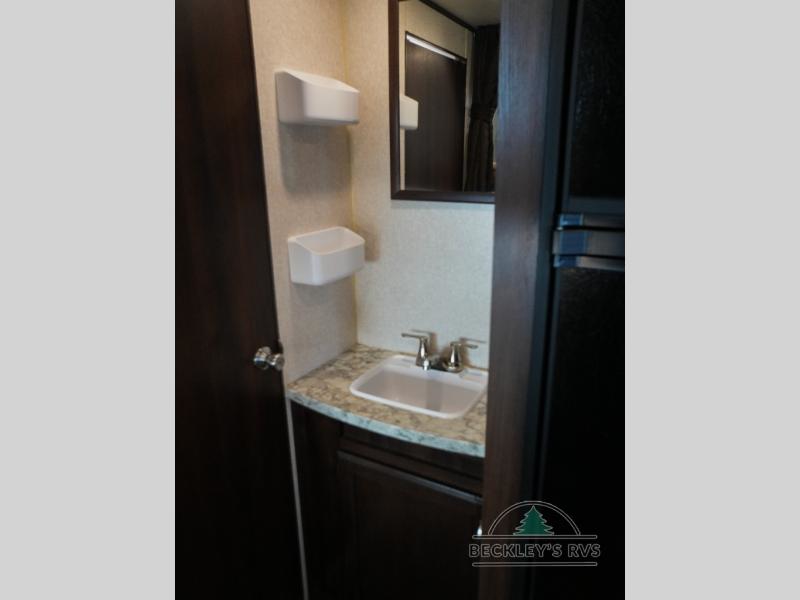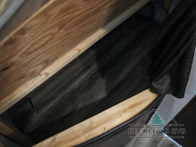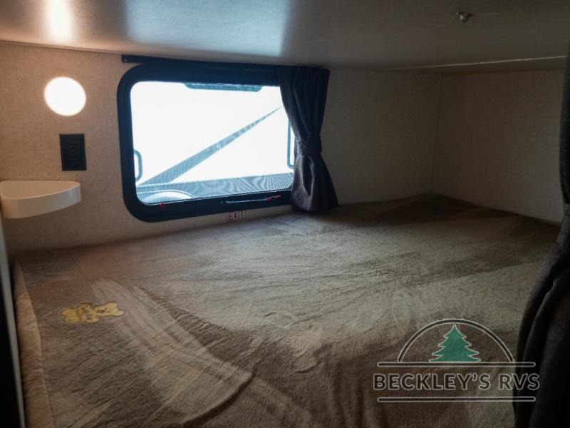 As you proceed toward the rear of the trailer, you will find a set of double bunk beds in the left corner of the travel trailer. With the double bunks you can sleep four people in this area!