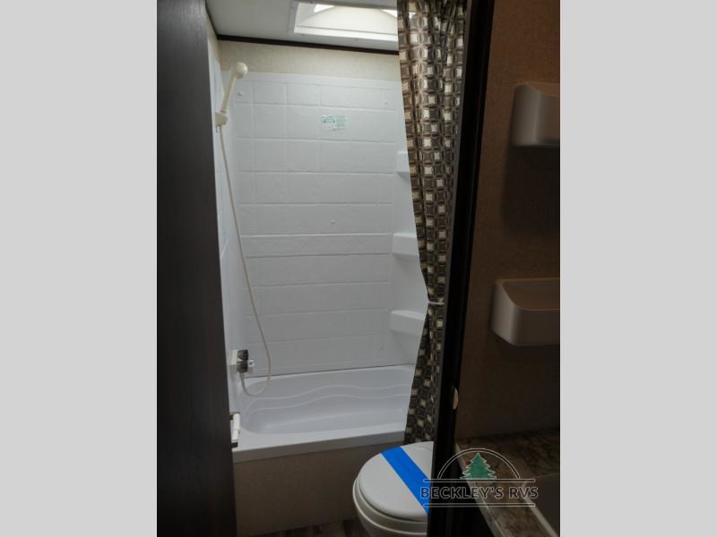 The bathroom is located in the right rear corner of the trailer. In the bathroom there is a tub/shower and toilet. Just outside of the bathroom area there is a sink.