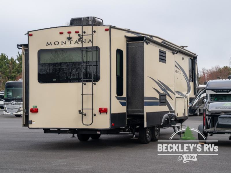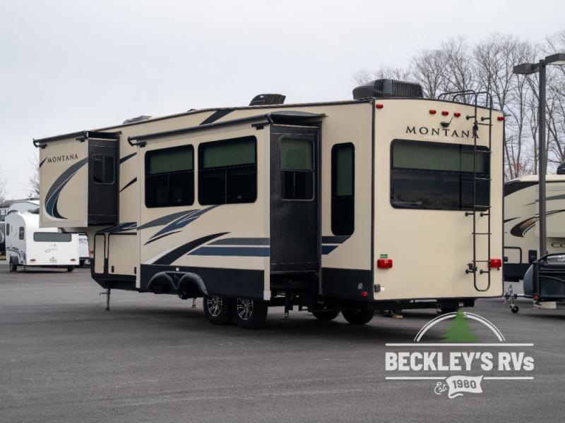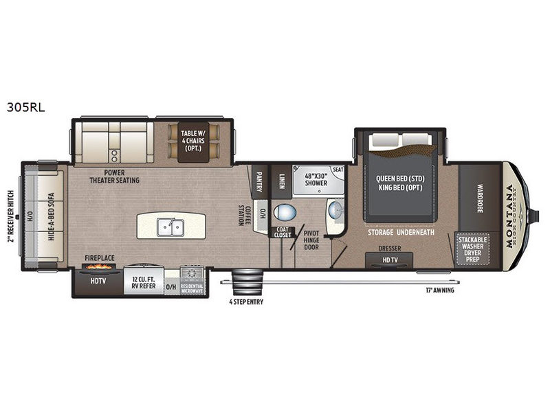 Step into this Montana High Country fifth wheel by Keystone and see how convenient your time away from home will be. Model 305RL allows you to move around freely with the triple slides. The main living and kitchen area offers a center island for extra prep space, a coffee station, a 12 cu. ft. RV refrigerator, and a HD LED TV above an electric fireplace controlled by a remote to keep you warm all year long. The front bedroom is a retreat away from it all with a shiplap design headboard for the queen bed and a 32" HD LED TV, plus there is plenty of storage for any trip. You might even like to hitch up your own bike rack to the 2" receiver hitch on the rear, plus more!