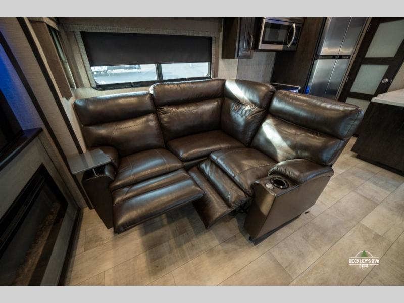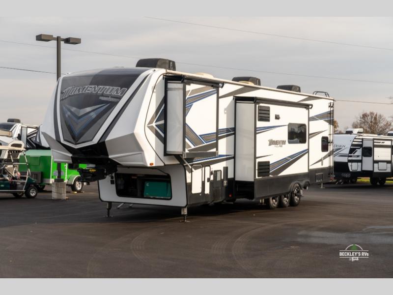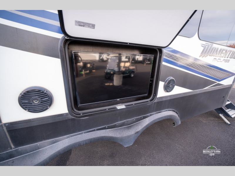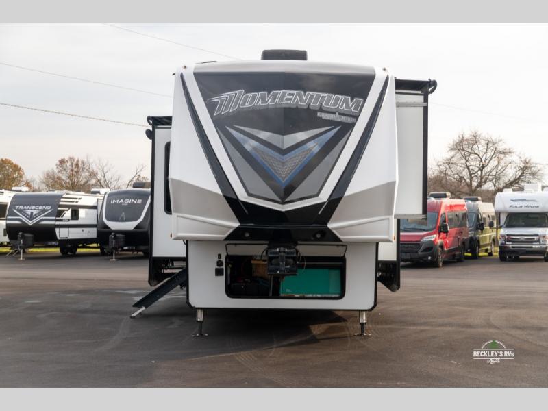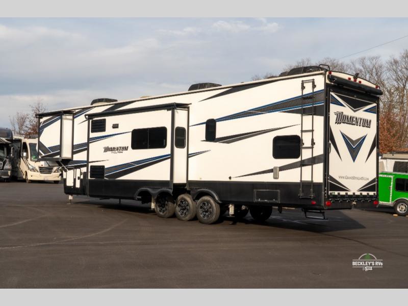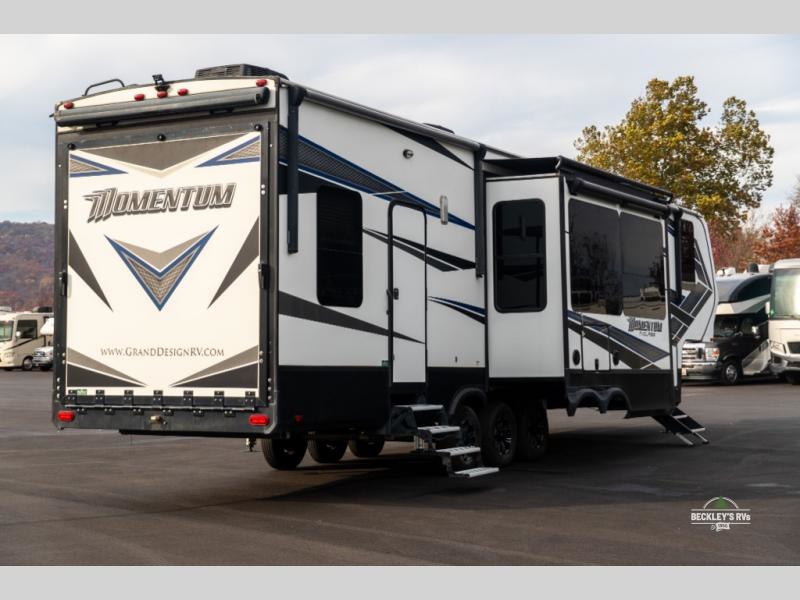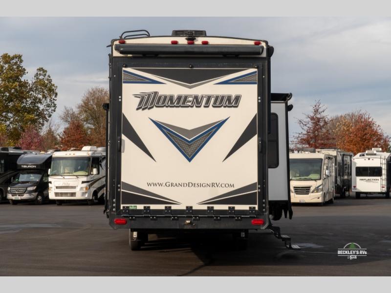 With any Momentum M-Class toy hauler fifth wheel you will enjoy extraordinary living with extreme playtime with the Weather-Tek insulation for four seasons of protection, and a fully enclosed fuel pump station to keep the fun going the whole time.  The Tuff-Ply garage flooring is gas and oil resistant, plus triple insulated.  You will find 2,500 lb. rated flush-mount tie-downs to keep your toys secure while moving down the road. The interior includes a sofa with headrest and removable swivel table, a convection microwave, a central vacuum system with tools and a dust pan, and a satellite/solar roof access channel to mention a few highlights.  Any Grand Design Momentum M-Class allows you to keep your active lifestyle no matter where you decide to stay!