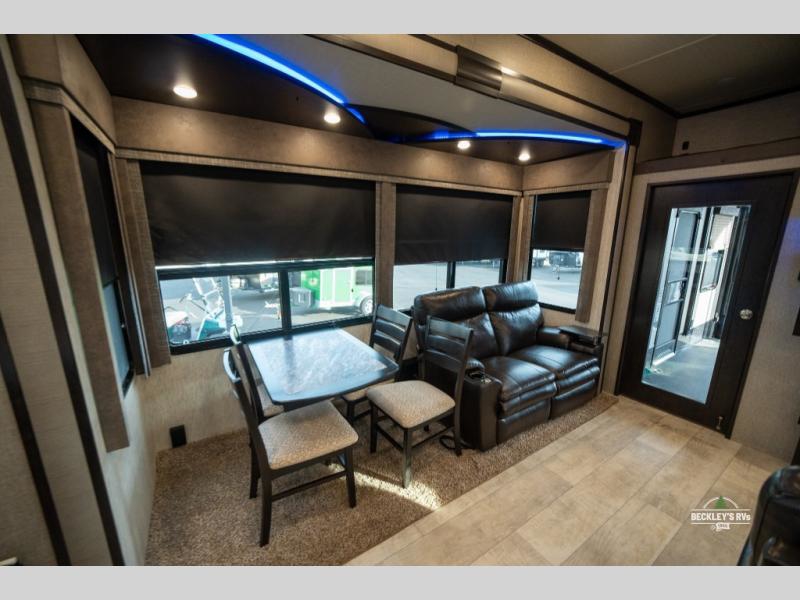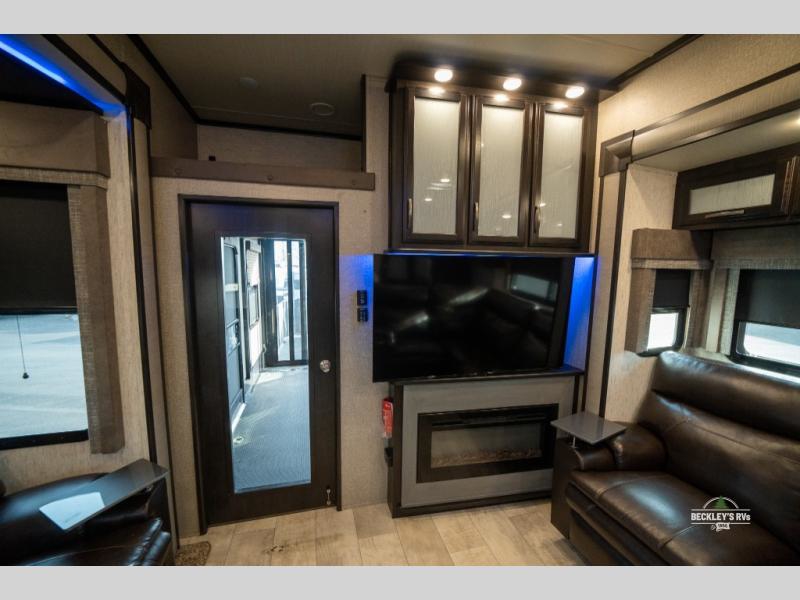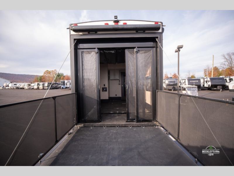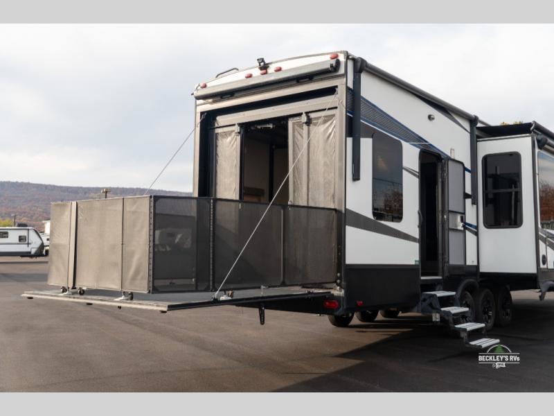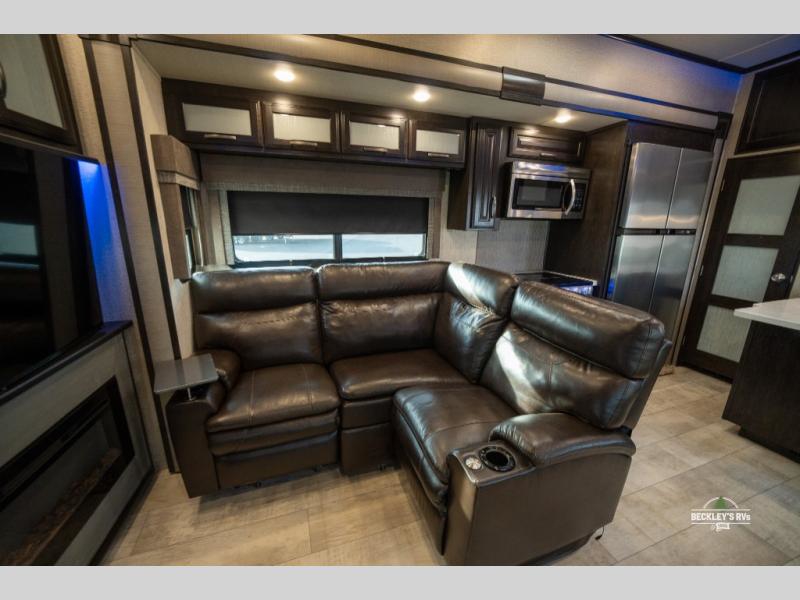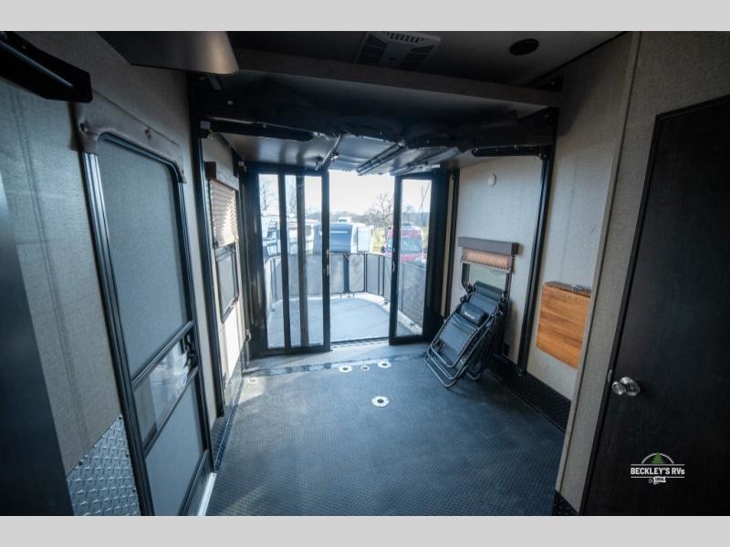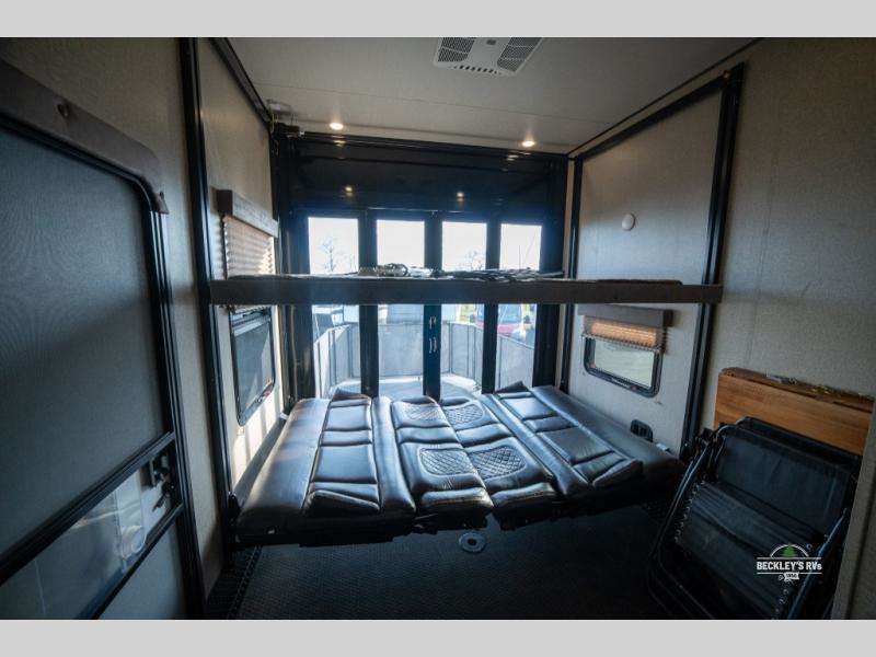 If relaxation and off-road fun have been calling your name, this Momentum M-Class 395M toy hauler fifth wheel will provide the luxury you love along with toy storage.  From the garage featuring 12'6" of space for an ATV and dirt bikes and a bath and a half bath to a kitchen and living area with theatre seating, an L-shaped sofa, and a fireplace with a 49" LED TV above, so you can relax indoors when you aren't having fun outdoors.