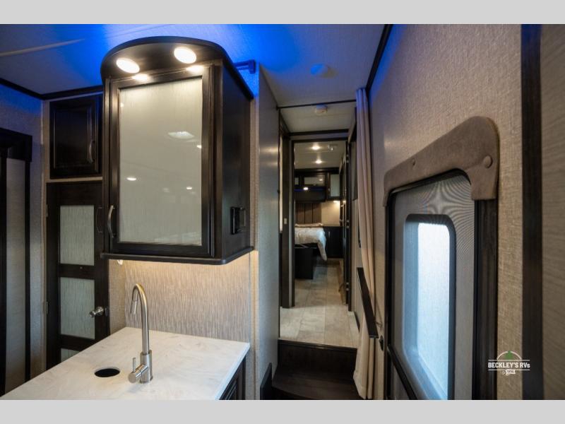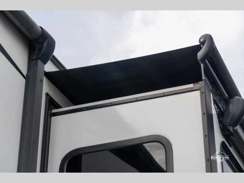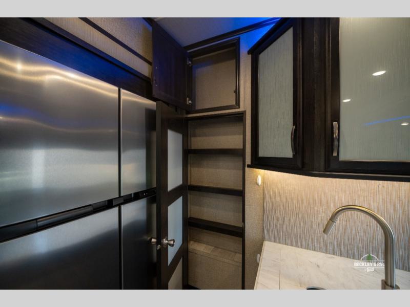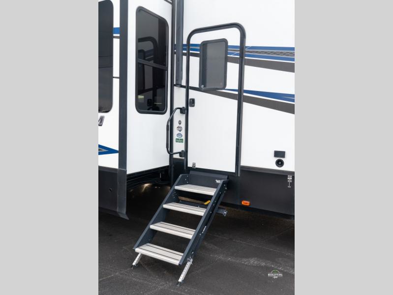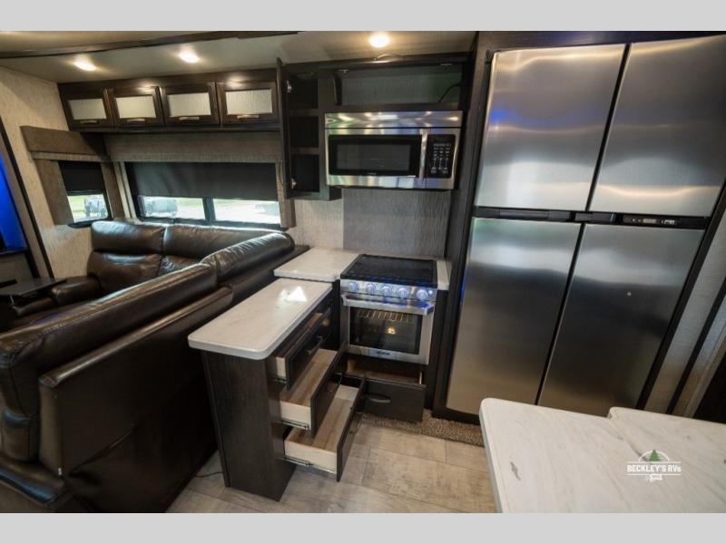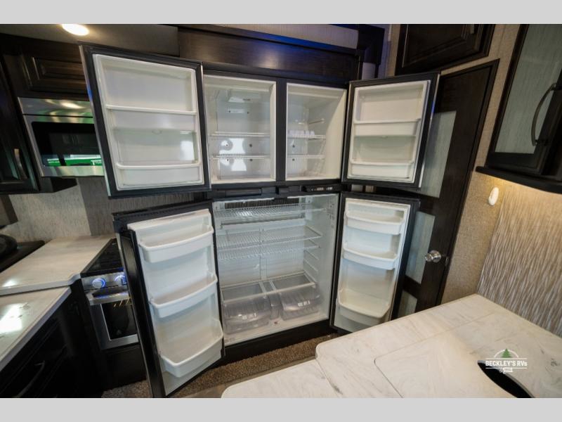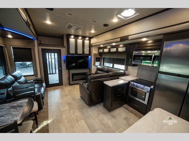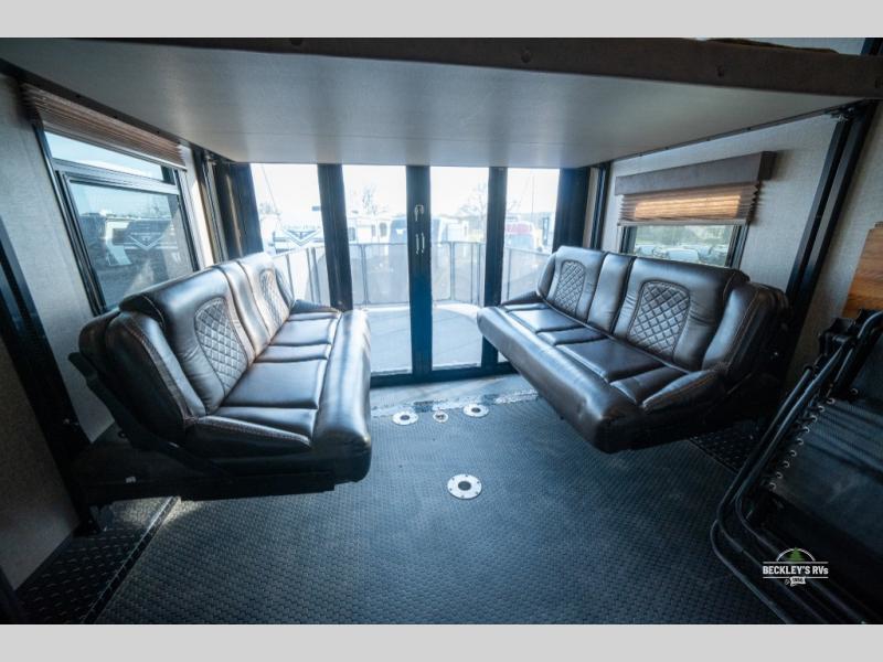 If relaxation and off-road fun have been calling your name, this Momentum M-Class 395M toy hauler fifth wheel will provide the luxury you love along with toy storage.  From the garage featuring 12'6" of space for an ATV and dirt bikes and a bath and a half bath to a kitchen and living area with theatre seating, an L-shaped sofa, and a fireplace with a 49" LED TV above, so you can relax indoors when you aren't having fun outdoors.